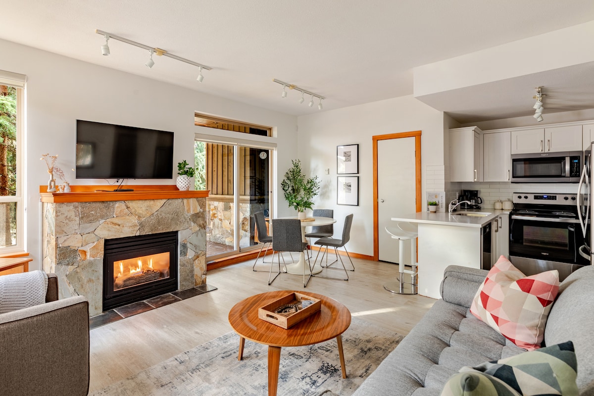 Updated condo with king bed in the bedroom and queen pull-out in the living room. Enjoy the fully stocked kitchen, Nespresso coffee, smart TV, work-from-home space, balcony, and gas fireplace! Designated ski-in/ski-out trail access by RMOW. Heated parking, hot tub, heated outdoor pool, fitness centre, ski and bike storage, and laundry in building. Located conveniently in the Marquise with ski access to Blackcomb, in a quiet area but close walk to main village stroll and nearby restaurants!