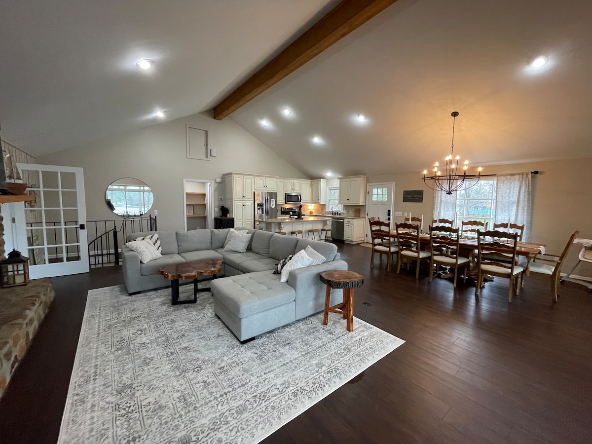 20 dönümlük arazi üzerinde tatil kaçamağı. 1100 metrekarelik kapalı verandaya sarılı 3/4 dönümlük özel gölet manzaralı. Gölet, kolay yakalanması için levrek ve çipura ile doludur. Ev ve gölet arasında kütük bankları olan büyük bir ateş çukuru. Harika ses sistemi! Misafirler cihazlarını ses sistemine bağlayabilir ve içeride ve dışarıda müziklerinin keyfini çıkarabilir. Gölde kürekli tekne ve ahırda can yelekleri var. Alt katta misafirlerimiz için buzdolabı, bilardo masası, dart tahtası ve diğer oyunlar var.