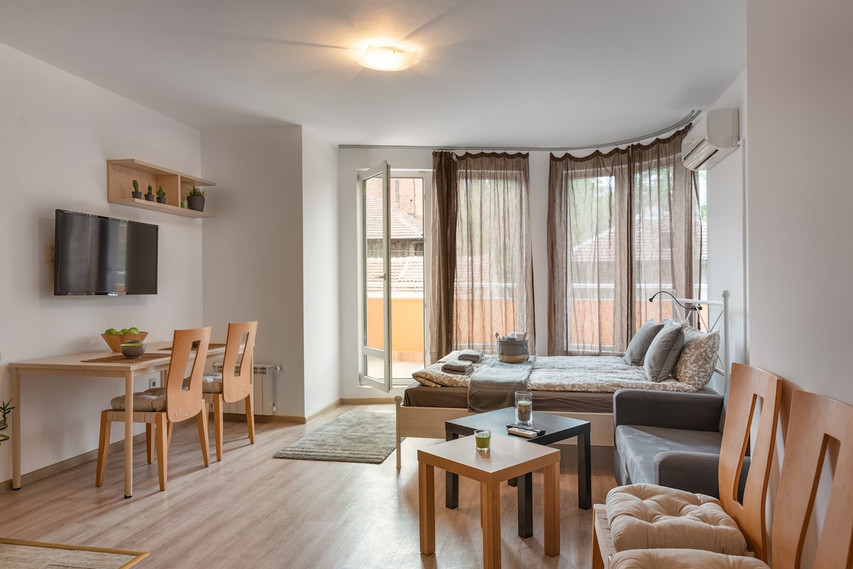 Welcome to my boutique attic studio at the foot of Vitosha. Bright, minimalist and peaceful space with beautiful mountain and city views. Located in a quiet, safe area—perfect for evening walks and relaxing away from the center. The bed features a Magniflex mattress and pillows for excellent rest. The studio has a fully equipped kitchen, fast Wi-Fi and a cozy work/dining area. Clean, calm and with easy access to both the mountain and the city.