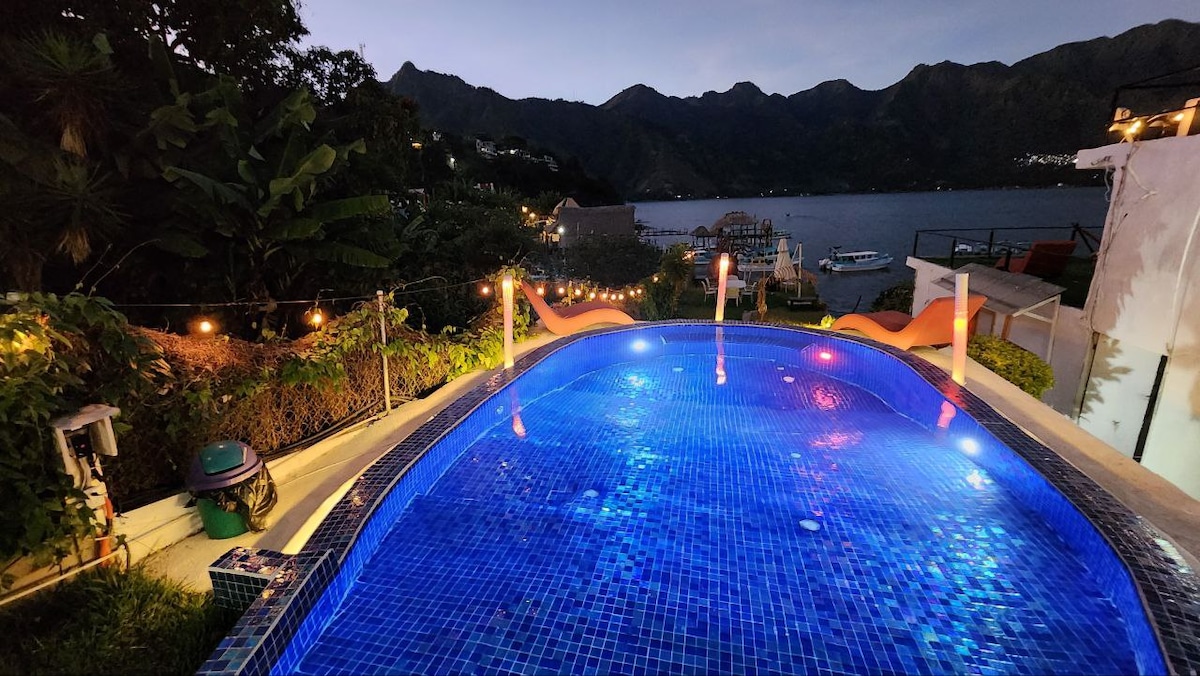 El Alojamiento ubicado en el tercer piso tiene una vista privilegiada e impresionante del Lago Atitlan y sus Montañas! puedes disfrutar del acceso al lago desde un hermoso muelle en el primer piso, gracias a nuestra perfecta ubicación en la calle principal de la zona viva y turística, puedes disfrutar de los mejores restaurantes del lugar, buenos bares, fiesta nocturnas, servicios turísticos, tour, tiendas, y mucho más.