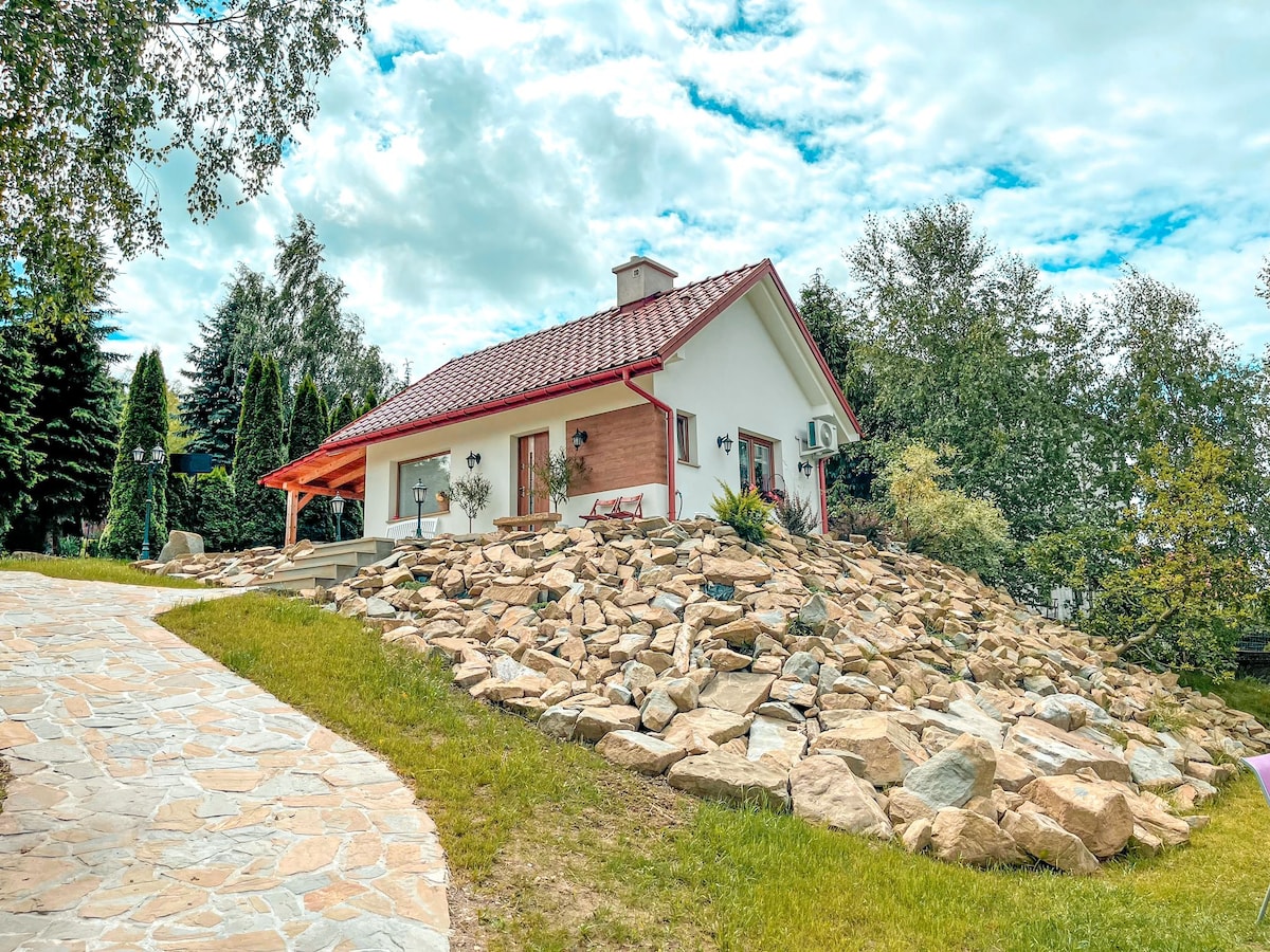 Yüksek standartlarda modern bir evi özel olarak kiralıyoruz. Ev, çatı katında iki yatak odası + tuvalet ve büyük bir mutfak ve zemin katta bir banyo ile bir oturma odasından oluşmaktadır. Kulübenin 40m2'lik bir terası vardır, kısmen çatılı, salıncaklı ve şezlonglar. Evde, mevsimlere/koşullara göre seçilmiş birçok atmosferik ışık, şömine ve dekorasyon bulunmaktadır. Kulübe, büyük bir parselin içinde durmaktadır. Misafirler için kamp ateşi ve oyun alanı mevcuttur. İlkbahardan sonbahara kadar arsamda çiçekli bir çayır var.