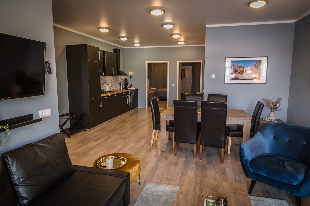 Tamamen yeni inşa edilmiş, aydınlık ve modern İskandinav tasarımına sahip misafir dairesi. Daire, tam donanımlı bir mutfak, yağmur duşlu bir banyo, büyük çift kişilik yataklı 1 yatak odası ve iki tek kişilik yataklı 2 yatak odası dahil olmak üzere rahat bir konaklama için ihtiyacınız olan her şeye sahiptir. Yaşam alanında 6 kişilik yemek alanı ve çift kişilik yatak olarak kolayca değiştirilebilen iki kanepe bulunmaktadır. Denize ve eski balıkçı köyü Eyrarbakki boyunca uzanan sahil yoluna sadece birkaç adım.