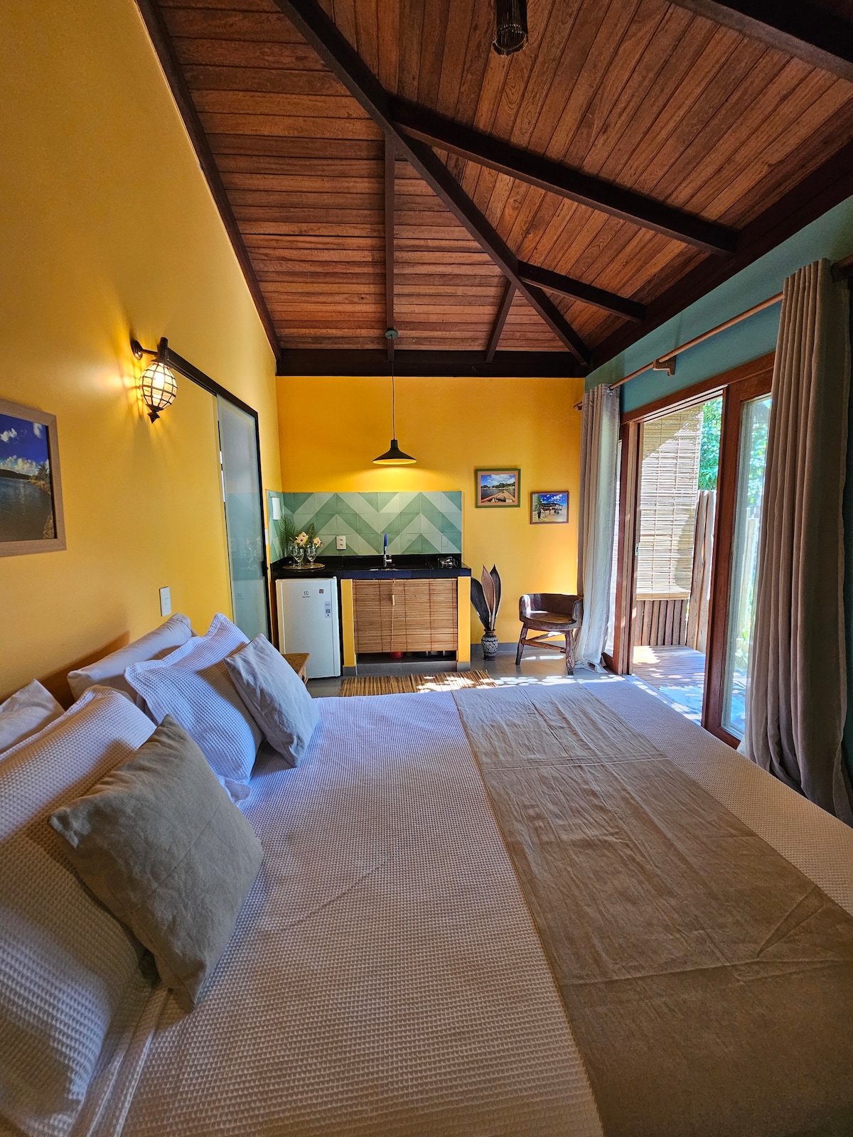 Chalé, kumun üzerinde, maraú yarımadasındaki en büyülü plajlardan birinin önünde. Fraktal dağ evi, site ile uyumlu cam ahşap bir yapıya sahiptir. Burayı çok özel kılan manzara. Misafirlerimize doğayla bağ kurarak benzersiz bir deneyim sunmak istiyoruz. Ek kahvaltı ayrı. Ayrıca misafirlerin yemeklerini hazırlamaları için açık alanda mutfak da sunuyoruz.