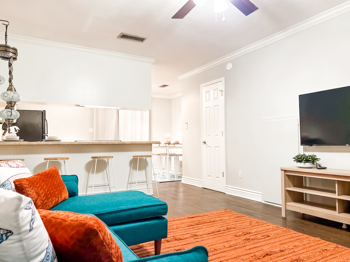 Welcome to your peaceful getaway, central to everything in Tallahassee! King bed ✔ Spacious, mural wall patio with a fenced back yard ✔ Private Parking ✔ Dogs Welcome ✔ Well-stocked kitchenette ✔ Mid-century charm ✔ Coffee, tea, snacks ✔ Cozy up with a movie in front of the custom wood slat wall, cook dinner in the kitchenette, and get a quiet night's rest under a stylish wood ceiling. You are: - 5 mins from TMH - 8 mins to downtown - 8 mins to FSU - 7 mins from I-10