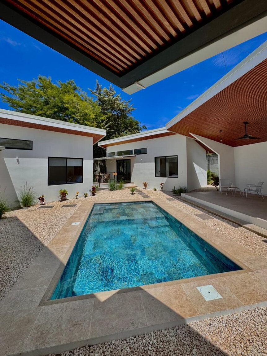 Beautiful new furnished vacation home. Two separate rooms with queen size bed fitting 4 pax. 👌 Close walking distance to the beach and restaurants in Avellanas. Spacious living/kitchen area. Big side by side refrigerator with icemaker bringing you shopping to the minimum. Kitchen full equipped wit coffee maker, blender induction stove. Natural deep stone Swimmingpool with waterfall.