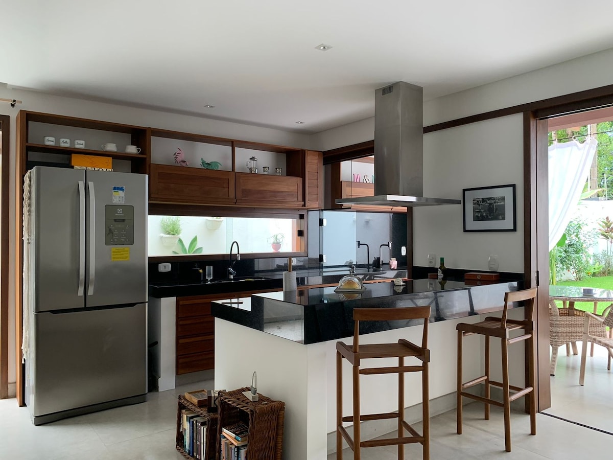 Arraial D'ajuda'nın (Condomínio Águas D'ajuda) en iyi lüks sitede bulunan, kumun üzerinde, yüksek standartlı güzel bir ev. Evimizin tamamı klimalıdır, 4 süiti vardır (ikisi kral yataklı, ikisi 2 tek kişilik yataklı (kral yatağa dönüştürülebilir) ve bir süitte iki tek kişilik yataklı bir salon vardır). Zemin katta geniş bir oturma ve yemek odası (lavabolu) ve büyük bir balkon (kanepe, hamak ve 8 kişilik masa) ile entegre tam bir mutfağımız bulunmaktadır.