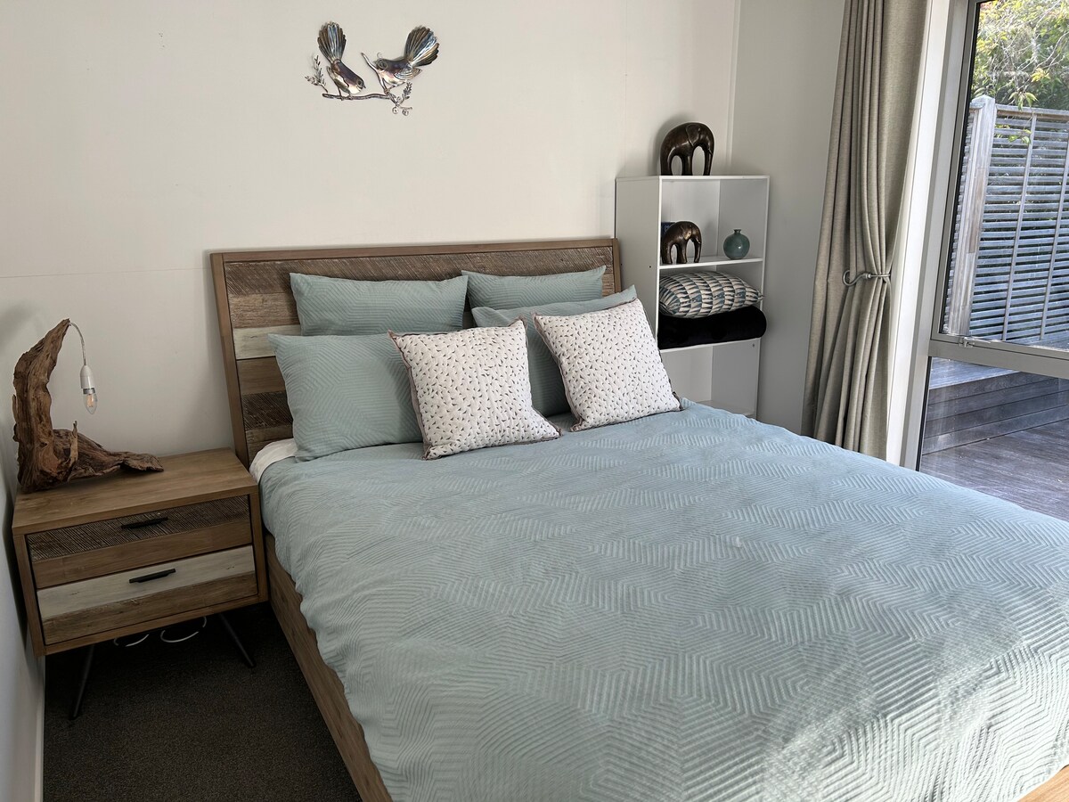 Bu, aile evimizin yanında bulunan konaklama yerimizdir. Sanatsal ve huzurludur. Yerleşik meyve ağaçları ve ailelerin yapması ve oynaması için birçok şeyin bulunduğu 1 hektarlık bir mülkün içinde yer almaktadır. Yatılı odada, uyuma yerinden yaklaşık 7 metre uzaklıkta ayrı bir yıkama alanı/küçük mutfak ve banyo vardır. Plaj evin tam karşısında ve Mapua arabayla 2 dakika mesafededir. Bizden sadece 30 dakika uzaklıktaki Abel Tasman'da yürüyüşten önce ve/veya sonra konaklamak için ideal bir yer.