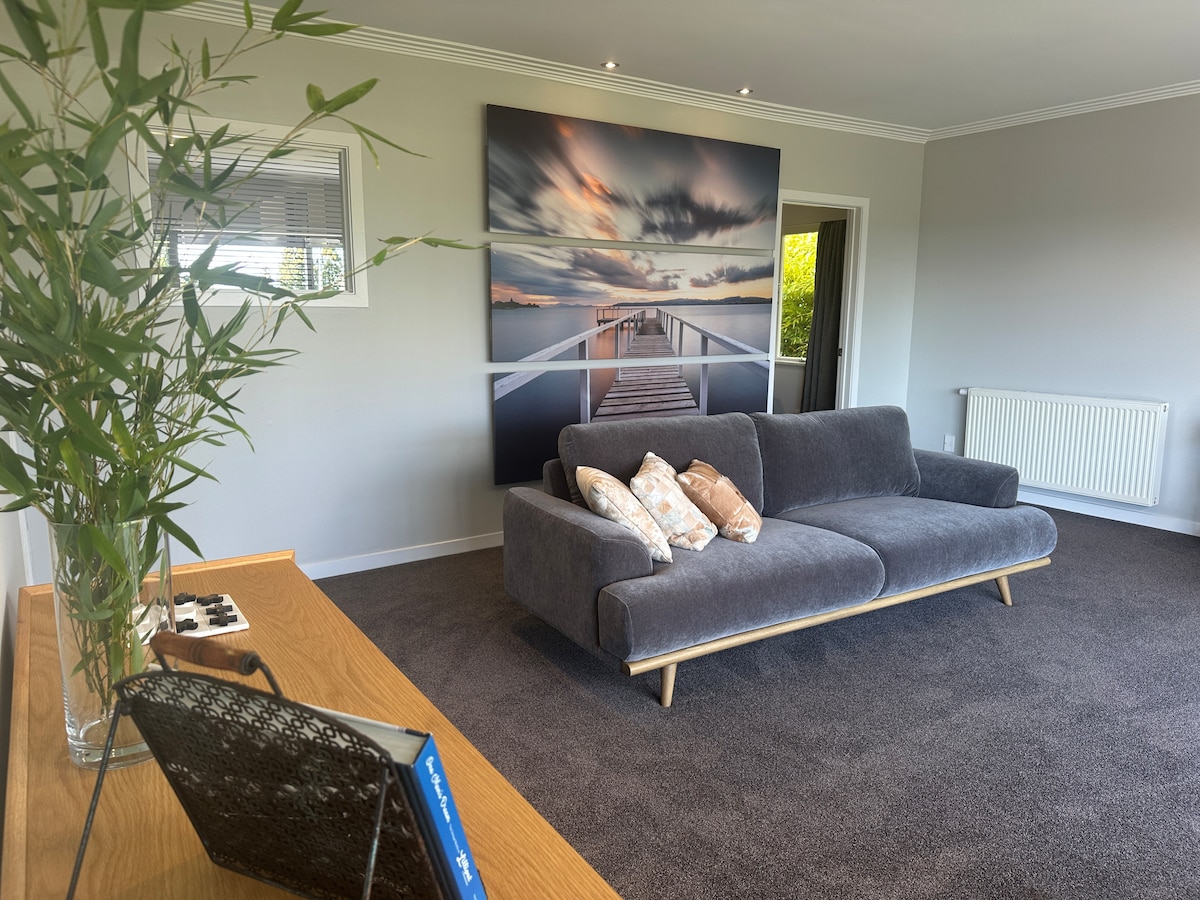 A 5mins drive from town or the lake or a 15mins walk to either. The entire home and garden are yours to enjoy. If cosy, private, quiet and a 'Home Away From Home' are what you are looking for, this small, 2-bedroom gem is it. Suitable for a maximum of two adults, you'll find a well-equipped kitchen, 2 comfy queen beds, Smart TV, bose speaker, sun deck, coffee machine and a roaring fire each evening. Off-street parking for 2 vehicles. Rear entrance is covered so you and your gear remain dry.