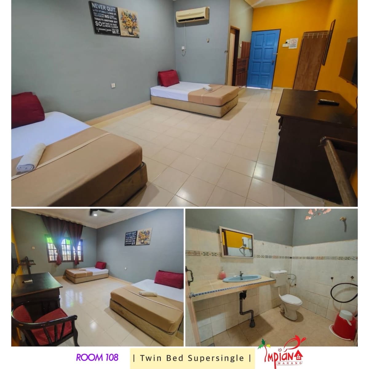 Impiana Marang Chalet'e hoş geldiniz. Köy ve plaj havasını bizimle deneyimleyin. Marang'ın iskelesine sadece 5 dakika ve Kuala Terengganu şehrine 20 dakika mesafedeyiz. Impiana Marang Dağ Evi aile aktiviteleri ve çocuk dostu için uygundur. Ayrıca gruplandırma etkinlikleri veya herhangi bir program etkinliği için de uygundur. Tesiste otopark mevcuttur. Ücretsiz kablosuz internet bağlantısı da sağlanır . Dua odası ve barbekü yeri gibi diğer olanaklar da sağlanır . Bizimle keyifli bir konaklama geçirin. Teşekkürler.