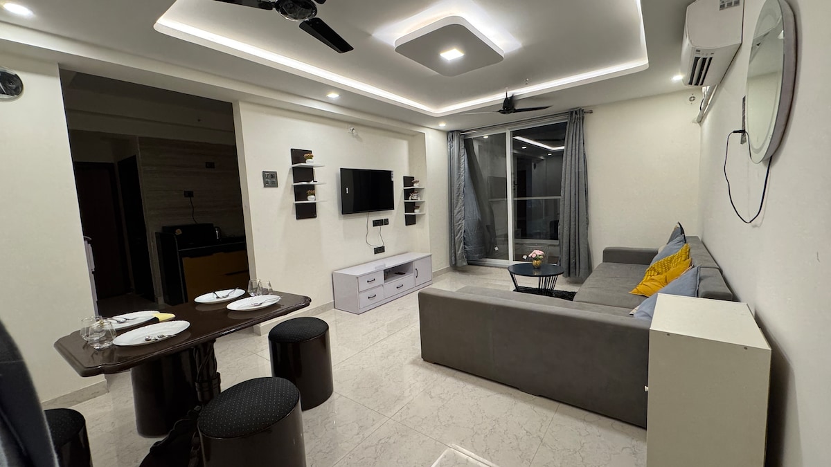 Beautifully decorated studio apartment with peaceful decor, enjoy the beauty of Mumbai in the serene location of Hiranandani Estate, at the heart of Thane, right beside five star hotel Planet Hollywood with all amenities for a cozy and comfortable stay. Just 500 meters away from the open air mall " The Walk". It’s having dedicated office space corner, dining space with dining table, fully furnished kitchen with necessary items, clean &hygienic washroom and Wifi available.