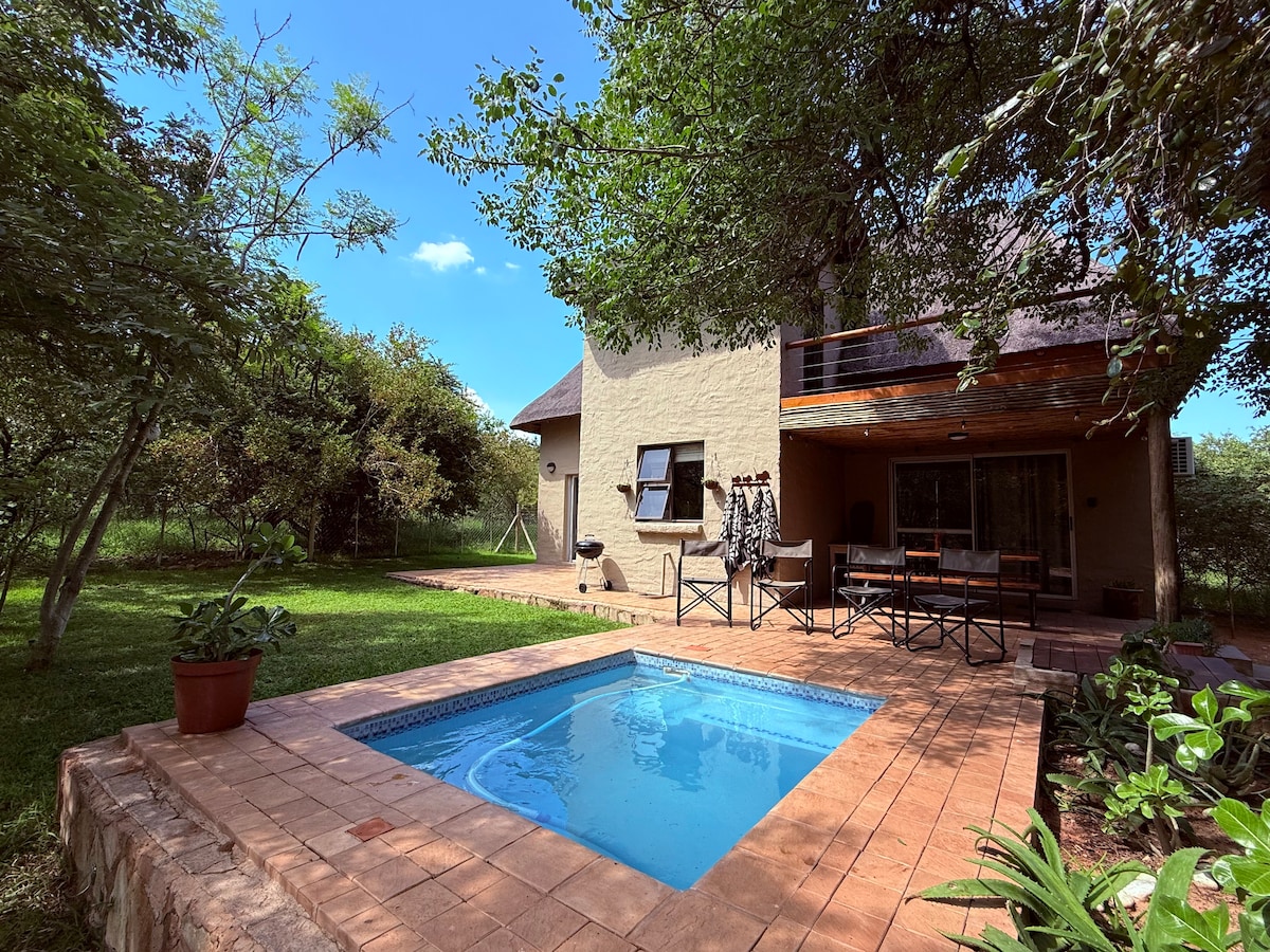Bushveld sıcağında serinlemek için kendi özel havuzunuz olan özel bir Bush Villa. Fantastik restoranlara ve mağazalara yakın, ancak birçok düzlük av hayvanının olduğu bir yaban hayatı arazisinde. Yürüyüş ve bisiklet için harika. Ülkemizin vahşi yaşam cennetinin tadını çıkarın. Orpen kapısına yakın konumdadır veya yakındaki Big 5 av sürüşlerinin tadını çıkarın. Villanın verandada açık havada yemek yemenin tadını çıkarmak için kendi ateş çukuru ve barbekü alanı vardır. Etrafınızı saran doğayla uyanın!