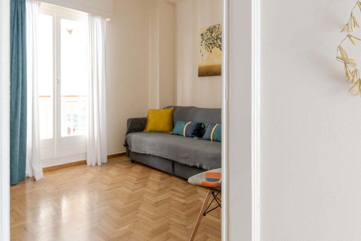 Irakleidon yayasında güzel, ferah, güneşli, harika bir daire, Thisseio'da sessiz ve yaşaması kolay bir semt, bir yatak odası, çift kişilik çekyatlı büyük bir oturma odası, 4 kişilik tam donanımlı bir mutfak ve masa ve PC'li bir ofis, güneşin tadını çıkarmak veya kaliteli zaman geçirmek için iki sevimli balkon, otobüs duraklarına kolay erişim, iki metro istasyonu ve Atina'nın merkezinde yapılacak ve görülecek tüm merkezi turistik yerler ve yapılacak ve görülecek şeyler. Çiftler, aileler, gruplar, profesyoneller için harika bir seçim