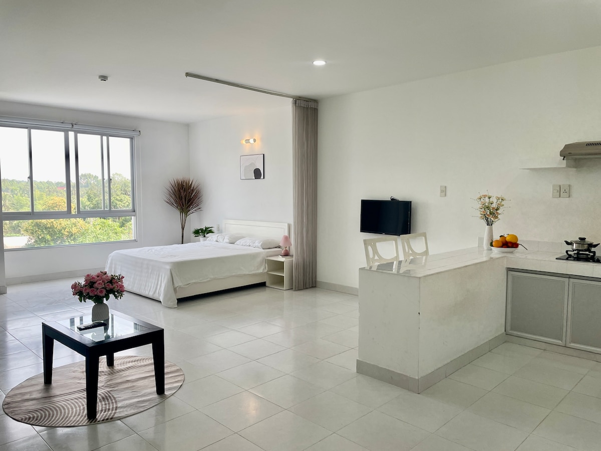 Nơi ở độc đáo này mang một phong cách rất riêng. Căn hộ 1 giường ngủ, nằm ngay tầng 4 (Tầng tiện ích của toà nhà: Dễ dàng sử dụng hồ bơi, khu vui chơi trẻ em, vườn hoa, khu BBQ ngoài trời, phòng xông hơi, GYM), vị trí trung tâm thành phố thường xuyên diễn ra các cuộc họp hội nghị, thương mại, dịch vụ. Có xe bus miễn phí đi trung tâm Hồ Chí Minh và ngược lại.