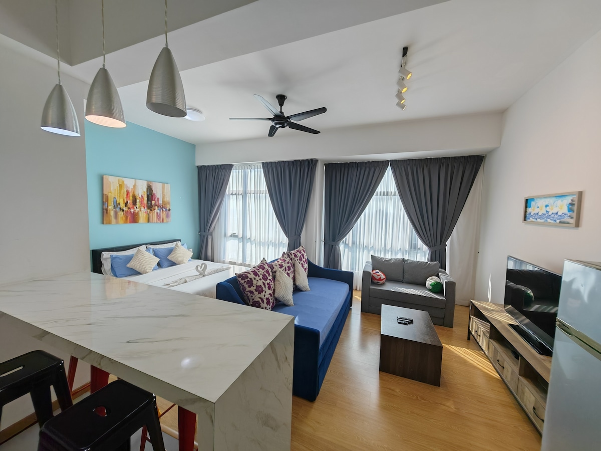 Enjoy private and calming stay in a studio for 2+1 guest apartment with sea & tropical view, direct private access gate to the beach. Nested beautifully facing the Pantai Balok of Kuantan, this place is located in Timur Bay Seafront Residence, Kuantan. This studio is facing the side sea and hills and palm trees as well as a tennis court view. Thus provides more privacy and peaceful for your beautiful stay. 100mbps Wifi, android TV, and a Bluetooth speaker equipped. Single room unavailable.