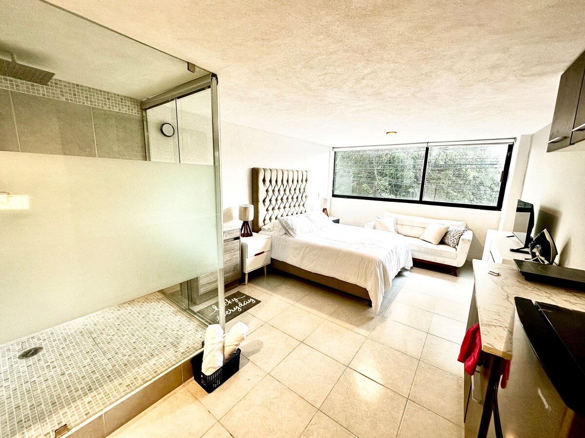 Tamamen bağımsız yönetici mini süiti, anahtarlar size verilir, sadece siz erişebilirsiniz, çalışmak veya ziyaret etmek için idealdir Bir yatak odası, buzdolabı, mikrodalga fırın, 24 saat 🔥 sıcak su, saç kurutma makinesi, akıllı TV ve 50 megabayt hızında internet bağlantısı bulunmaktadır Toluca ve Metepec için merkezi bir konumda bulunmaktadır