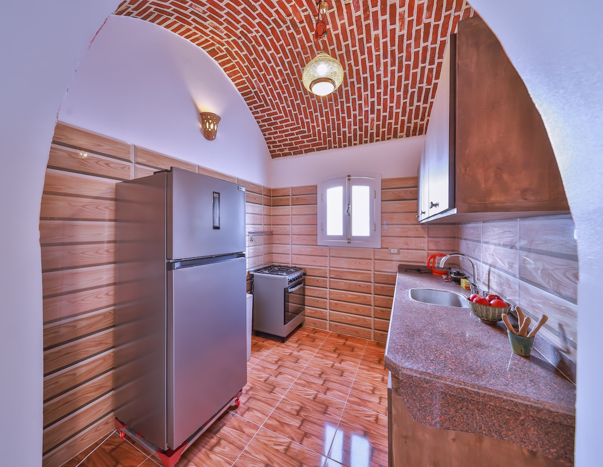Huzur mu arıyorsunuz? Luxor'un Batı Şeria'sındaki sessiz bir köyün kenarında yer alan, kubbeli tuğla tavanlara sahip geleneksel Arap tarzı bir evdeki bu zemin kat dairesi dört kişiyi ağırlayabilir. Büyük oturma odası, sahibinin orijinal sanat eserleriyle doludur ve geniş yatak odalarının her birinin kendi banyosu vardır. Nil'e, antik eserlere ve tüm olanaklara yakın olan evin önünde ve arkasında çeşmelerin bulunduğu iki rahat bahçede dinlenin.