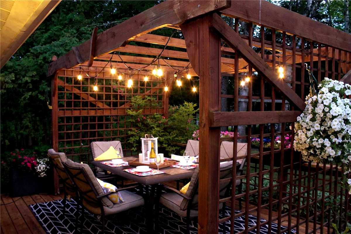 LÜTFEN OKUYUN! Mt. St. Louis & Horseshoe Valley kapınızın önünde! Burası aydınlık, geniş ve özel bir misafir süitidir (bodrum dairesi). Jakuzi, veranda, ateş çukuru ve doğanın tadını çıkarmak için ormanda tenha bir yol. Mutfakta indüksiyonlu ocak ve gerekli her şey, hatta şarap şişesi açacağı bile var:) TV ve Roku ile açık konsept oturma odası/mutfak/yemek odası. Yatak odası bir sanat eseri: karanlık, gizemli ve romantik! Mülkümüzden kurtarılan yıpranmış ahır ahşabından yapılmış özel Queen yatak.