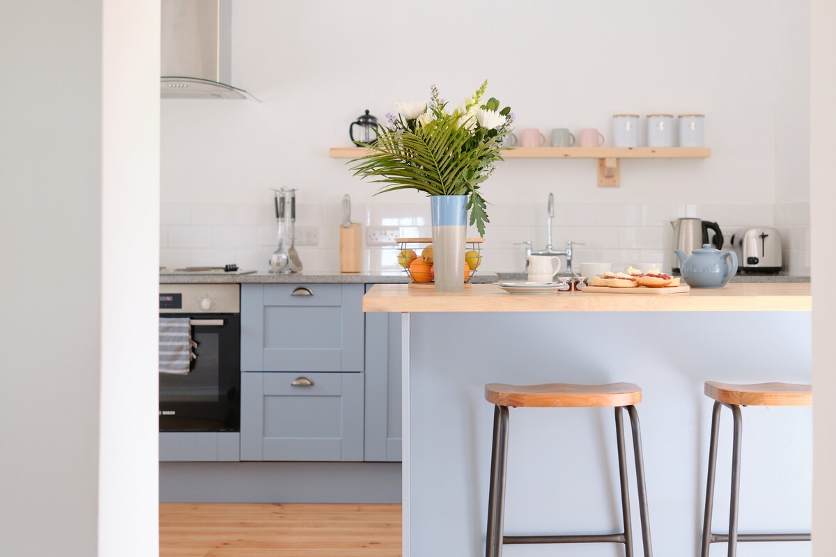 Güzel, modern, aydınlık ve rahat, bağımsız. King yataklı ek bina, geniş ebeveyn banyosu ve kahvaltı malzemeleri. Sahildeki aile evimize bitişik ancak kendi girişi olan özel bir ev. Özel garaj yolunun hemen dışında ücretsiz park yeri. Sanat galerileri, mağazalar, restoranlar, kafeler, barlar ve bağımsız bir sinema ile Newlyn/Penzance plajı, limanı ve sahil yolu tepeden aşağı 3-4 dakikalık yürüme mesafesindedir. Marina, ada feribotu ve tren/otobüs durağı bulunan Penzance Town, Penzance sahili boyunca 25 dakikalık güzel bir yürüyüş mesafesindedir.