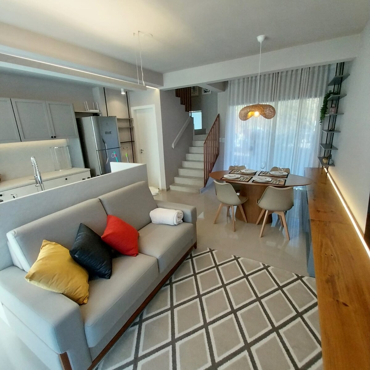 Novo decorado, sob medida, dois dormitórios, um de casal c/ TV, um de solt. c/2 camas, uma auxiliar e um pufe cama.Os dois quartos c/ mesa para note. Um banheiro c/ todos itens, incluindo secador de cabelo. Cozinha c/ microondas, forno elétrico, suggar, cooktop, geladeira,torradeira, air fryer, ferro elétrico e água filtrada. Água quente, lava e seca, sala de estar c/ sofá cama, integrado c/ sala de jantar, cozinha e churrasqueira. Todo climatizado, orientação solar ótima e telas nas janelas.