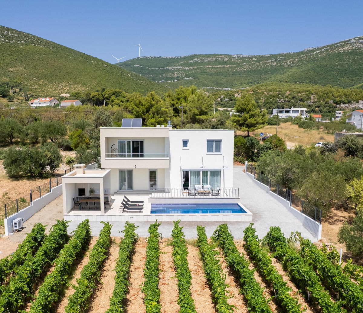 Charming seaside villa surrounded by a private vineyard, just minutes from Split. Enjoy stunning sea views, a heated pool with hydromassage jets, and a traditional stone barbecue for relaxed Mediterranean evenings. The villa offers 4 comfortable bedrooms, a bright open-plan living area, and complete privacy in a peaceful setting. Perfect for families or friends seeking sun, sea, and authentic Dalmatian charm.