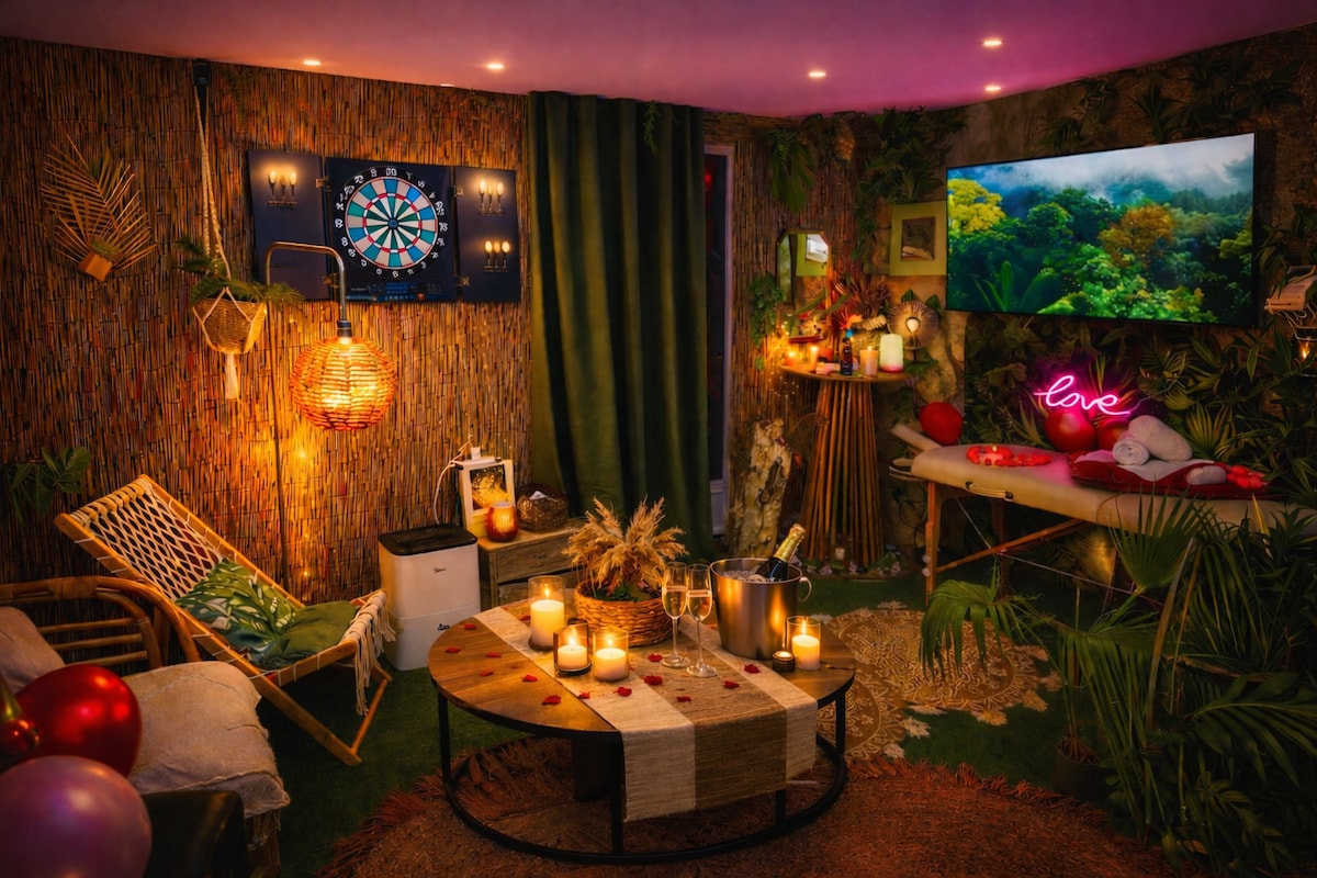 ✨ Loire kıyılarında zarif bir parantez olan Mirage Tropical'i keşfedin 🌴. Her şeyden uzaklaşmak için spa, masaj masası, zarif bir teras ve egzotik bir orman alanının keyfini çıkarın. Dart oyununda eğlenin, egzotik bir aperitif paylaşın veya benzersiz bir atmosferde dinlenin. Akşamları oda, şık ve romantik bir an için büyüleyici renklerle aydınlanır💖. Burada her ayrıntı, unutulmaz anılar yaratmak için konaklamanızı güzelleştirir.🌴❤️❤️💕💕💕👄🫂❤️