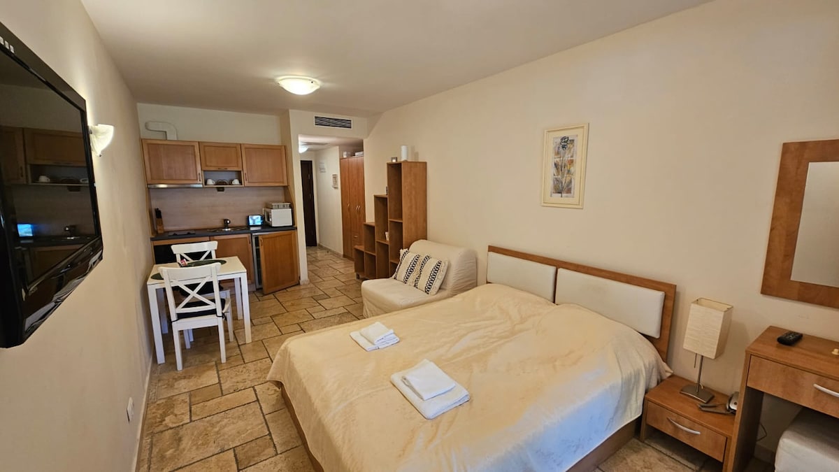 Mükemmel bir konumda bulunan bu mekândan Kavarna kasaba merkezine, yerel plaja (3 km uzaklıkta) ve çevredeki Karadeniz bölgelerine kolayca erişmenin keyfini çıkarın. Yaşam alanı, donanımlı mutfak ve geniş 20 metrekarelik terasa açılan genişletilebilir uyku alanına sahip açık planlı stüdyo. Bir kişi için mükemmel, iki kişi için rahat. Ücretsiz otopark. İnternet. Televizyon yok. Uzun süreli konaklamalar için harika.