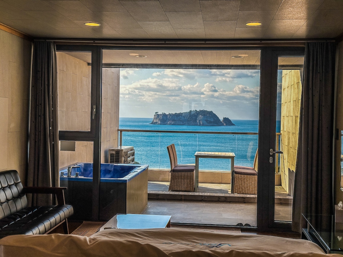 Hello. Perched on a cliff in central Seogwipo, this suite offers ocean views where islands and sea meet on one horizon. The 66㎡ private space keeps you apart from other travelers. Studio-style, yet spacious, with separate bedroom, living, and kitchen zones for an easy flow. On the terrace, soak in the spa and enjoy a private barbecue above the water. Free breakfast served with wide sea views. May to October, swim in the infinity pool facing Beomseom. The rooftop garden captures Jeju sunsets.