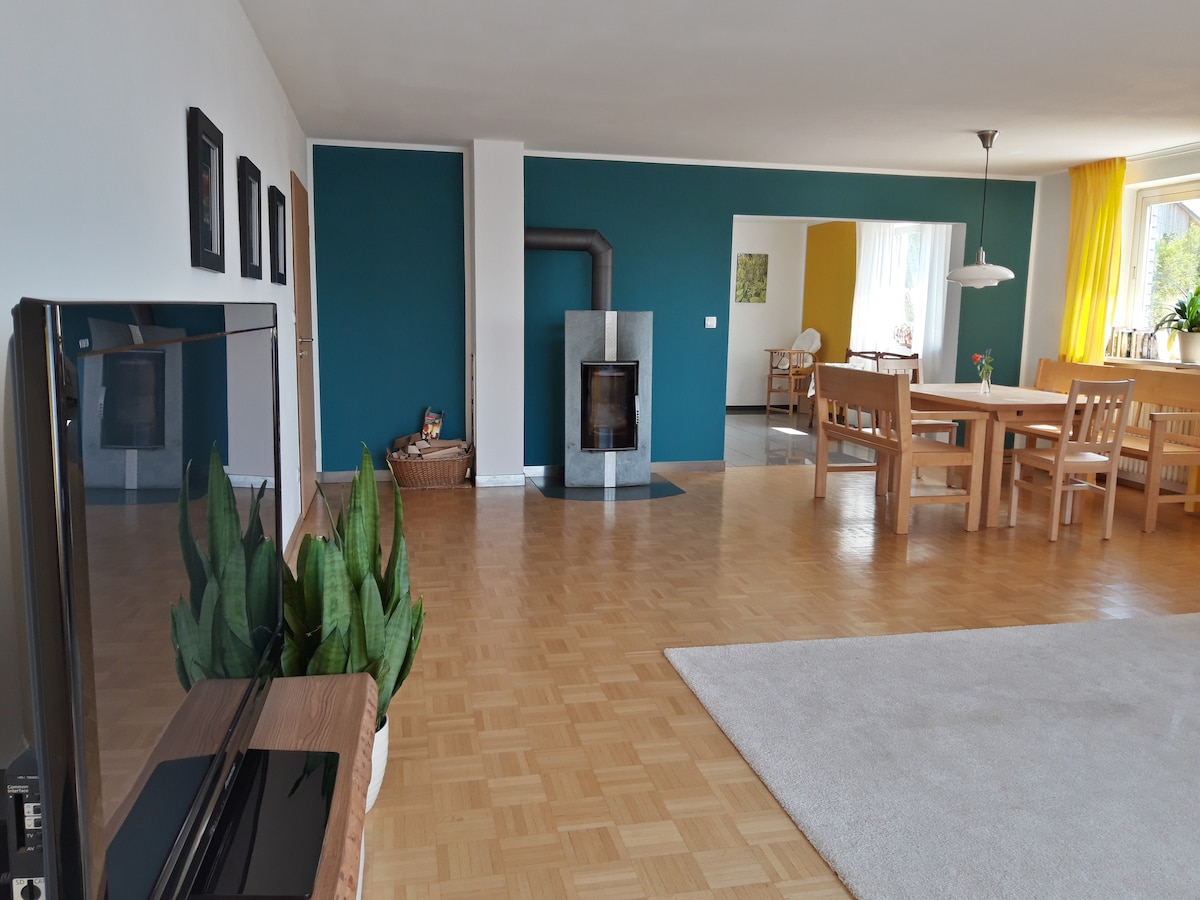 Nouveau tarzı 120 yıllık evimiz, Münih ve ünlü kaleler arasındaki güzel ve şaşırtıcı Alpler öncesi arazilerde bulunmaktadır. Misafir evimizde yemek pişirmek için ihtiyacınız olan her şeyin bulunduğu büyük bir mutfak, iki adet rahat ve bireysel yatak odası ve modern bir banyo bulunmaktadır. Oturma odasında romantik bir şömine vardır. Mekan aileler, çiftler ve arkadaşlar için mükemmel.