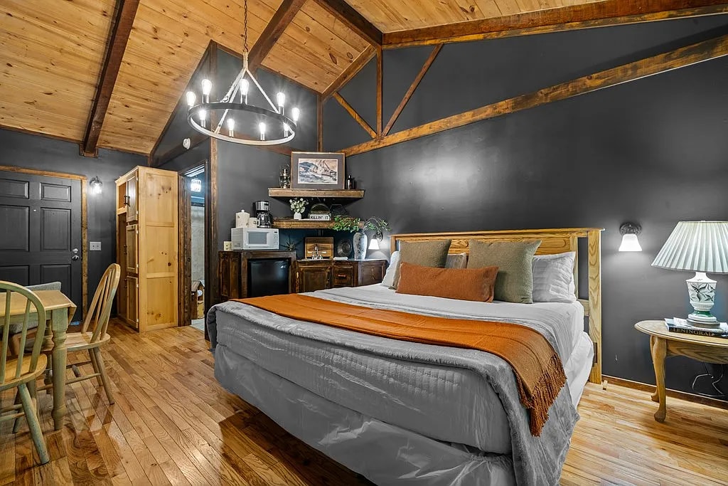 Bu büyüleyici, türünün tek örneği yerden ayrılmak istemeyeceksiniz. Blue Ridge Suite'in özel bir balkonu ve girişi vardır veya büyük verandanızdaki ana girişi kullanın. Süitte tam donanımlı bir mutfak ve tam boy buzdolabı bulunmaktadır. Güzel bir queen kütük yatak ve bir yataklı çekyat. Sevimli küçük koltuklarınızda ateşin önünde dinlenin. Yataktan veya özel balkonunuzdan manzaranın keyfini çıkarın. Great Room'da stoklanmış ücretsiz kahve barının keyfini çıkarın.
