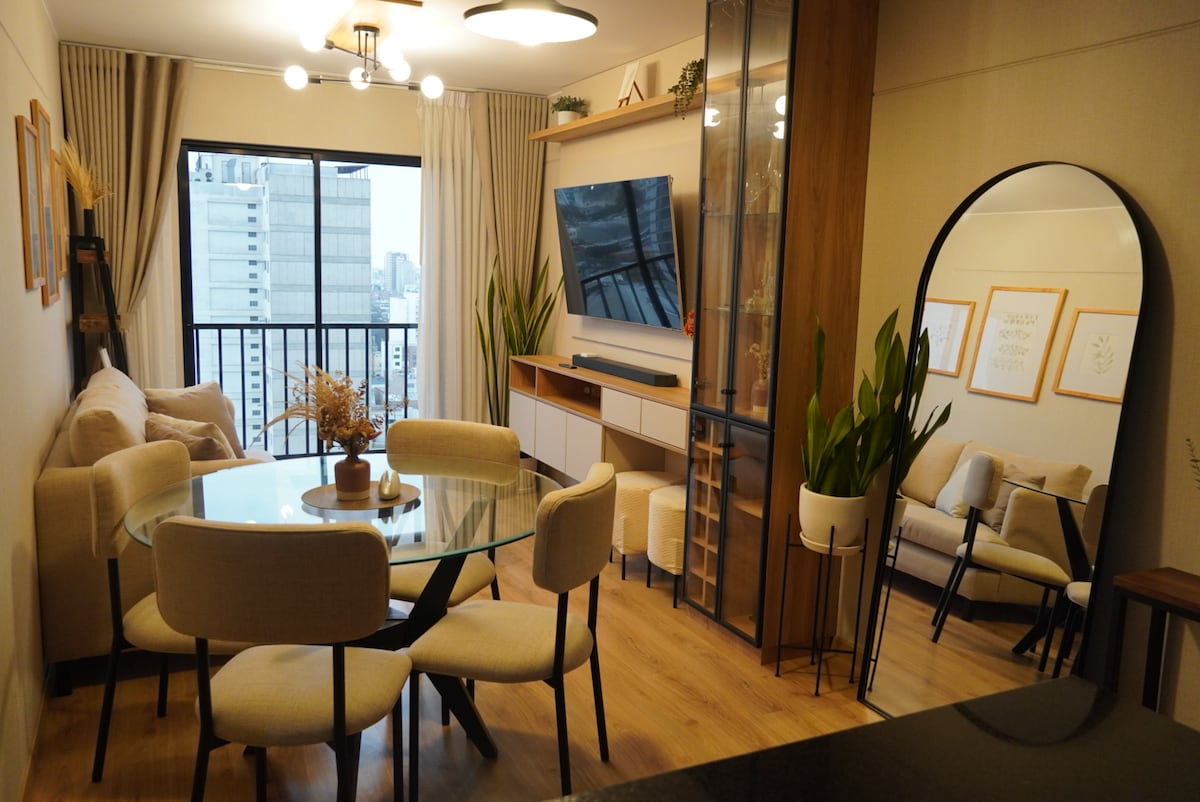 Modern apartment with balcony and panoramic city view. Enjoy a 55" Smart TV with Netflix and Disney+, fast Wi-Fi, a fully equipped kitchen with water filter and espresso coffee station. Queen bed, washer-dryer, home office space, smartkey and 24/7 self check-in. Perfect for remote work, business trips, or long stays.