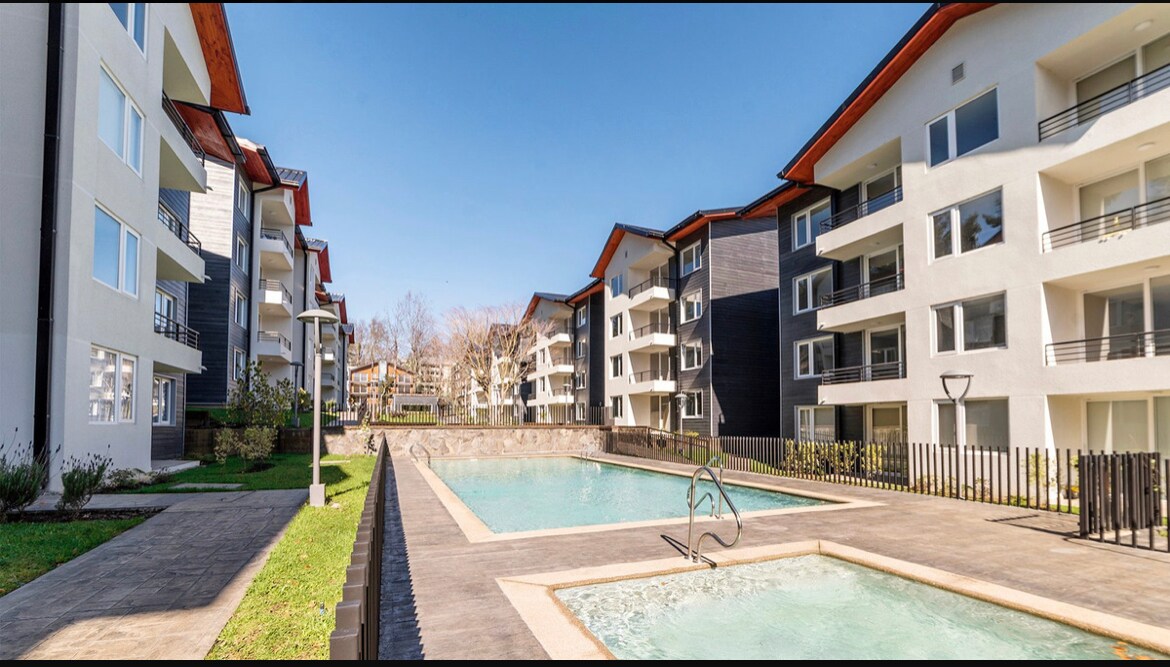 Güzel bahçeleri olan özel bir konutta bulunan, ebeveyn banyolu, oturma-yemek alanı ve açık mutfağı olan rahat bir tek yatak odalı daire. 2 misafir için mükemmel. Keyfini çıkarın: Çocuklar ve yetişkinler için uygun🏊♂️ havuz. Çocuklar için🏰 oyun alanı 🌲 Kulüp evi 🧖♂️ Sauna ve jakuzi (ekstra ücret alınır). 📍 Konumu ideal, şunlara yakın: Pucón şehir merkezine🏘️ 5 dakika. 🏞️ Plajlar Kayak merkezine⛷️ 25 dakika. Huife kaplıcalarına♨️ 40 dakika. Botanik termal parka🌿 25 dakika. 🌄
