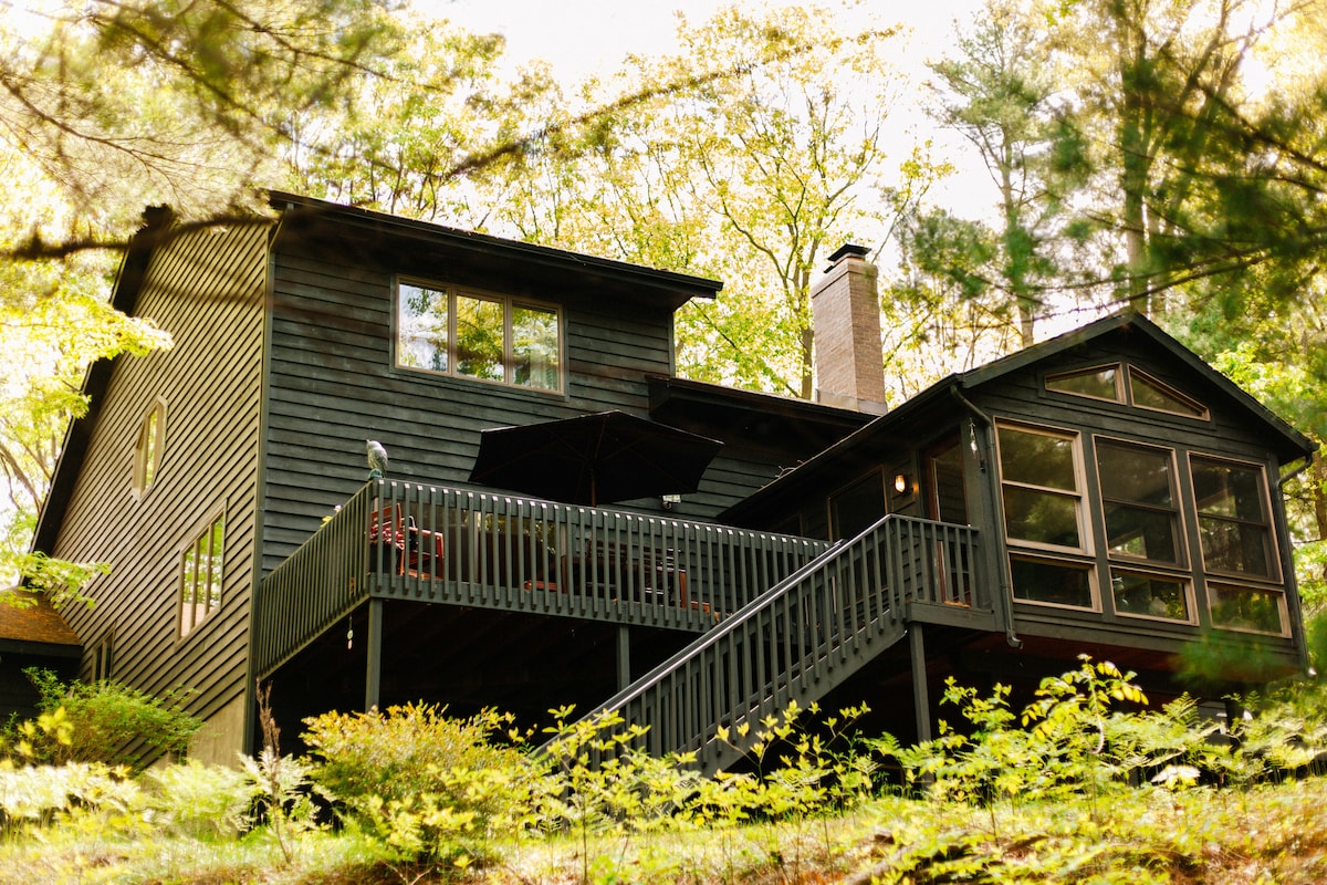 Tucked deep within 10 private acres of Allegan State Forest, this modern log home and renovated shipping-container offer the perfect escape. Step outside the front door straight into endless miles of xc ski, snowshoe and hiking trails (xc skis/boots/poles and snowshoes are provided). After a day in the snow, return to the warmth of a crackling fire. Down a private ¼-mile paved drive, you’ll find pure calm and comfort—no neighbors, no noise, just winter serenity in the woods.