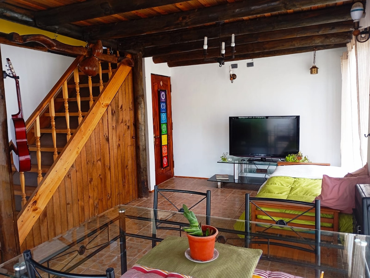 Casa de un ambiente, cómoda y equipada con cama matrimonial, baño privado, cocina, refrigerador, clóset y wifi de alta velocidad 3GB. Hay mesita y sillones de mimbre en el jardín para descansar y comer en un entorno agradable y relajado. El patio y el quincho se comparten con la casa principal, pero siempre están libres y disponibles para ti. El barrio es tranqui y seguro. La playa está a 7 min. caminando. Estacionamiento frente a la casa. Pantalla de TV s/cable. Y hay 3 supermercados cercanos.
