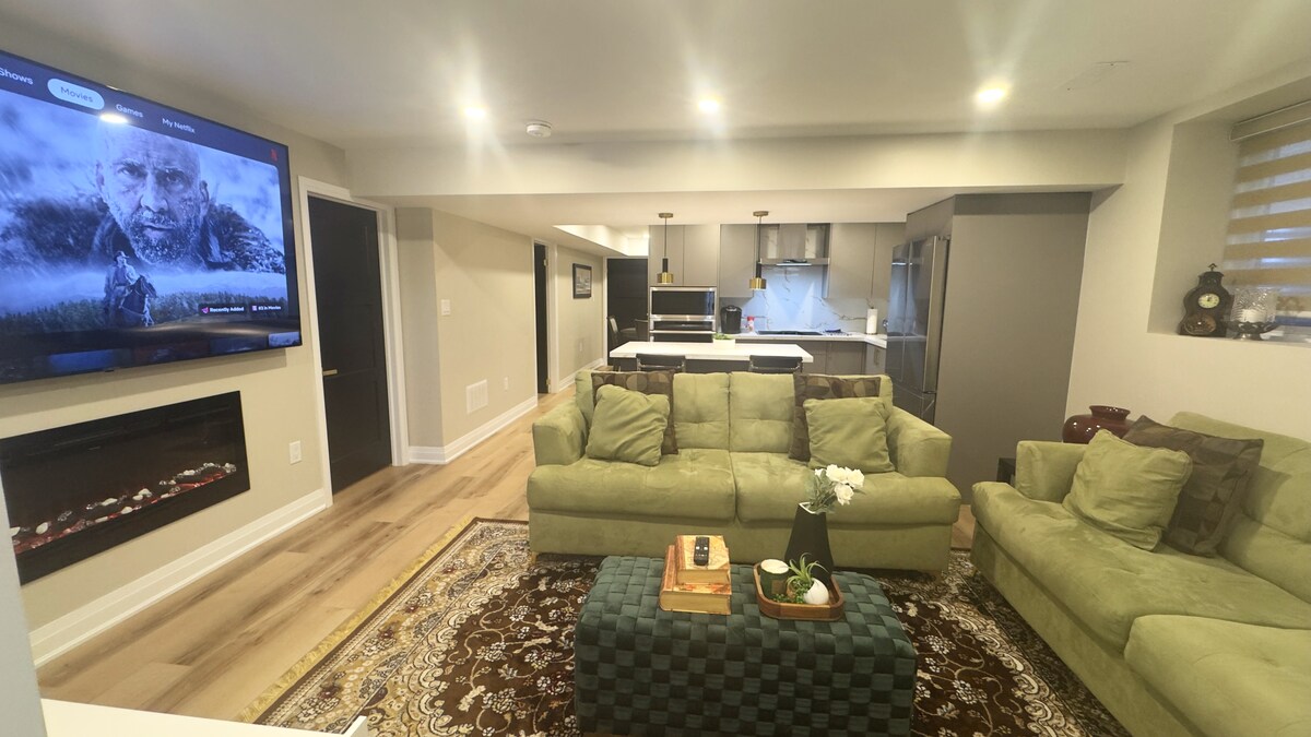 ✨ 218 CM SİNEMA VE SPA İNZİVASI | LUXE 2 YATAK ODALI ✨ Ayrı girişli bu yeni tasarımcı tamamen özel bodrum süitinde 5 yıldızlı lüksü deneyimleyin! 🎬 HOOK: Gerçek bir ev sineması havası için devasa 86" 4K TV + Netflix 🛁 LÜKS: Yağmur duşlu 2 özel spa banyosu 🍳 ŞEF: Gurme Mutfak ve Kahve Barı 📍 MEKÂN: Wilcox Gölü'ne 5 dakika yürüme mesafesindedir. Kanada'nın Harikalar Diyarı'na 15 dakika. Toronto şehir merkezine 25 dakika. 🏡 Rahatlık ve Rahatlık: 2 Kraliçe Yatak Hızlı kablosuz internet bağlantısı Özel Çamaşırhane Ücretsiz park yeri