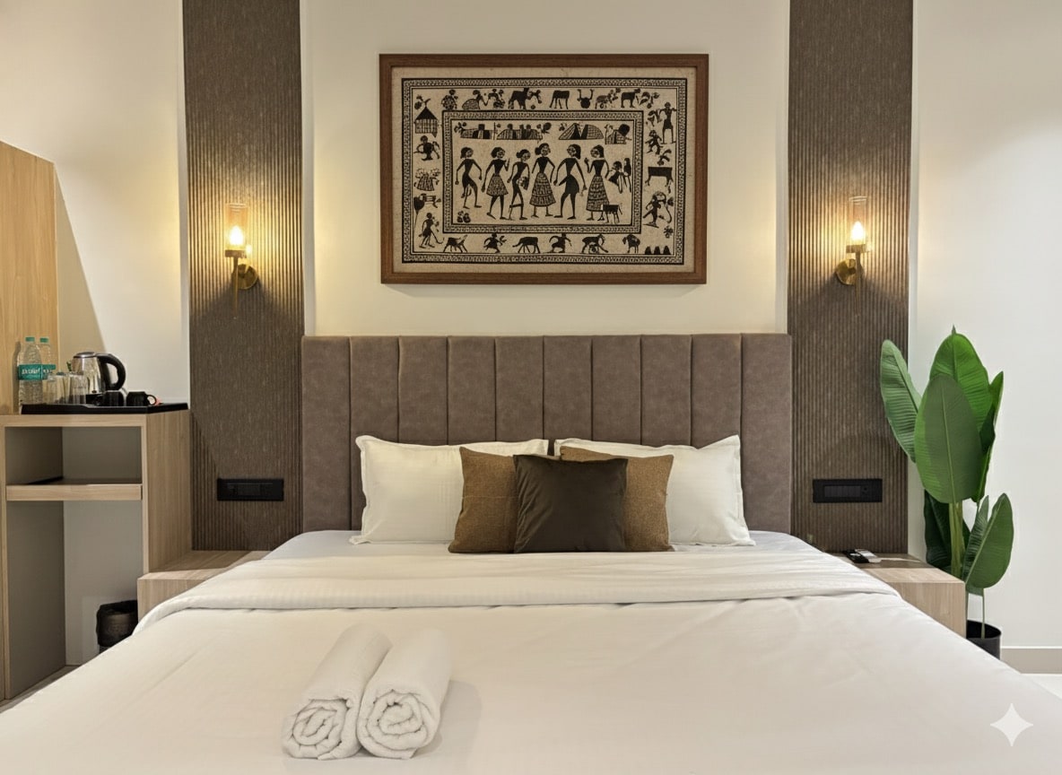 Discover the magic of Varanasi while staying in a modern, comfortable hotel room right in the city centre. Perfect for travellers who want a relaxed, luxurious base with all the must-see spots just minutes away. Prime Location - 2 km from Varanasi Railway Station - 3 km from Ganga Ghat - 4 km from Kashi Vishwanath Temple - 3 km from Kaal Bhairav Temple NOTE - Staff are available at the property to assist with check-in and any needs during your stay.