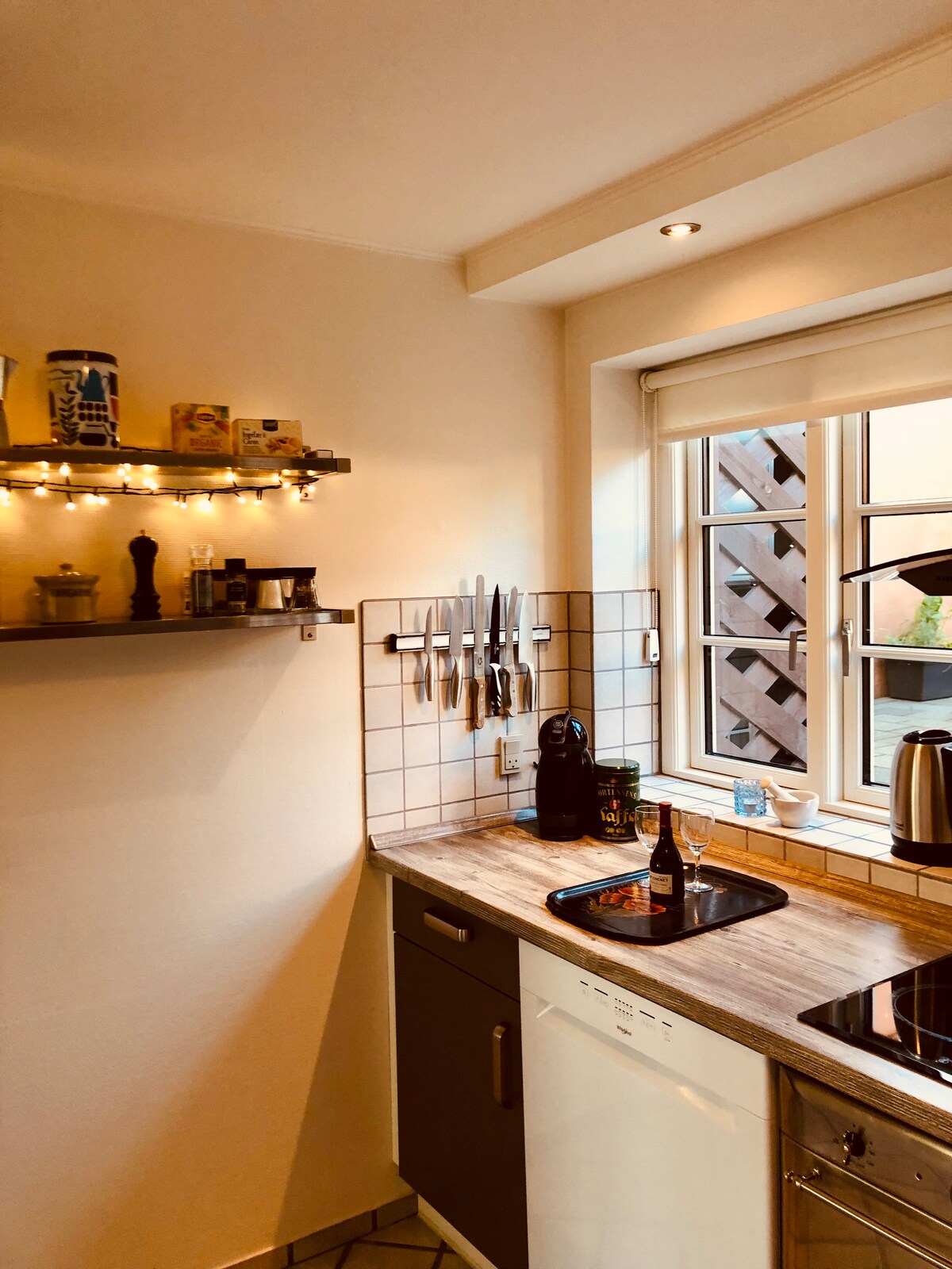Çift kişilik yataklı yatak odası, banyolu oturma odası, bulaşık makinesi ve çamaşır makinesi ile tam donanımlı mutfak ve yeni, modern banyo. Çatı katında üç çeyrek yatak, masa ve gün boyu güneş alan büyük özel çatı terasına doğrudan çıkış, barbekü, salon mobilyaları ve yemek alanı bulunmaktadır. Merdivenlerin altında ekstra uyku alanı. Merkezi konum, sessiz çevre, bol ışık ve yeşil alanların güzel manzaraları. - 1,6 km. Vejle İstasyonu - 250 m. Netto (süpermarket) - Legoland/Lalandia'ya 28 km - 2,4 km. Dalga