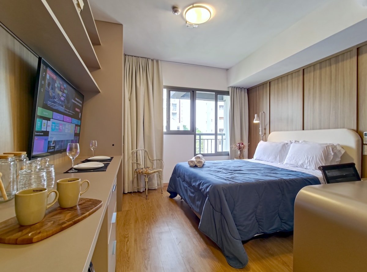 Barlar, restoranlar ve kafelerle dolu bohem ve sanatsal Vila Madalena'nın tadını çıkarın. Bölgeyi tanıyabilir, hatta ücretsiz olarak sunulan bisikletle şehir parklarına tur yapabilirsiniz. İşe mi geleceksiniz? Ağaç tepelerinin güzel manzarasına sahip yeşil balkona bakan konforlu masada odaklanın. Sonuçta, tamamen boş zamanlarınız için spor salonu, havuz, sauna ve bilardo salonunun keyfini çıkarın.