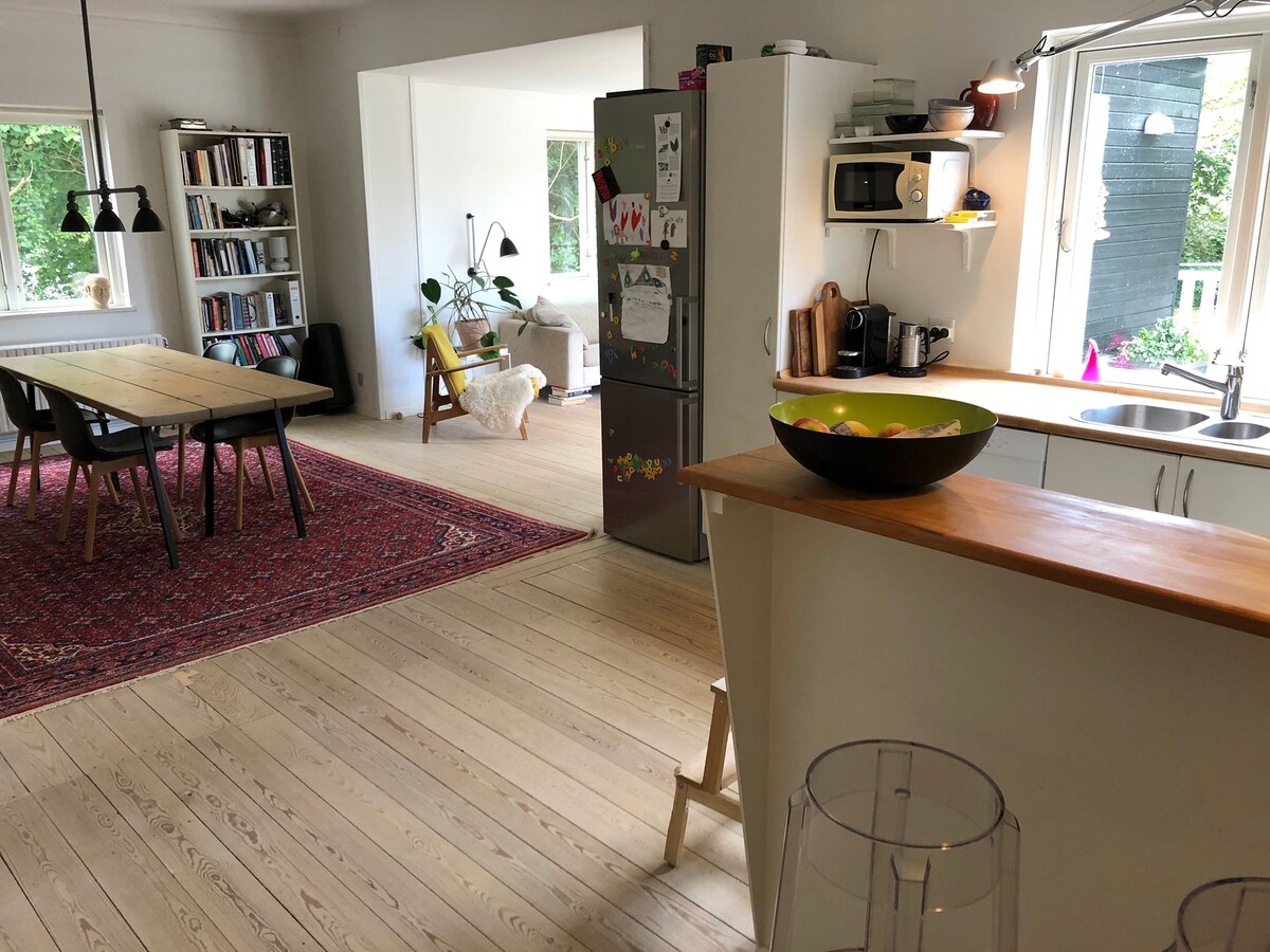 Özel girişten geçerek parlak resimler, klasik fotoğraflar ve tipik İskandinav dekoruyla dolu bir iç mekana adım atın. Daire, mimar tasarımlı villamızın alt katıdır ve üst katta yaşıyoruz. Küçük gölgeli bir teras, odun sobası ve büyük sırılsıklam küvetine de sahip 100 metrekarelik daireyi tamamlıyor. Daire bulaşık makineli tam donanımlı bir mutfağa, büyük küvetli bir banyoya, geniş bir yemek odasına, şömineli ve ¾ yataklı büyük bir oturma odasına ve ¾ yataklı bir yatak odasına sahiptir. Ekstra yatak veya bebek yatağı ayarlanabilir. Çamaşır makinesine erişim. Kendi özel terasınıza ve ücretsiz otoparkınıza erişiminiz olacaktır. Kendi girişiniz ve küçük terasınız olan ayrı bir daireniz olacak. Çamaşır odasına erişiminiz olacak. Daire büyük villamızın alt katıdır. Uzun yıllardır Aarhus'ta yaşıyoruz, şehri seviyoruz ve size semt ve şehir hakkında tavsiyelerde bulunmaktan memnuniyet duyacağız. Bu daire şehirden sadece 2 kilometre uzaklıkta sessiz, aile dostu bir semtte. Ormanda yürüyüş yapın ve bisiklete binin ve birkaç dakika içinde plaja yürüyün. Kısa bir yürüyüşle Tivoli Friheden eğlence parkına ve Marselisborg Kalesi'ne ulaşacaktır Şehir otobüsleri hemen köşeyi dönünce hafif raylı sistem ve tren istasyonu 3 km uzaklıktadır. Kapımızın hemen dışında ücretsiz park yeri bulunmaktadır. Ancak lütfen bir girişin önüne park etmemeye dikkat edin) Bu daire, şehirden sadece 2 kilometre uzaklıktaki sessiz, aile dostu bir semtte villamızın bir parçasıdır. Ormanda yürüyüş yapın ve bisiklete binin ve birkaç dakika içinde plaja yürüyün. Kısa bir yürüyüşle Tivoli Friheden eğlence parkına ve Marselisborg Kalesi'ne ulaşacaktır