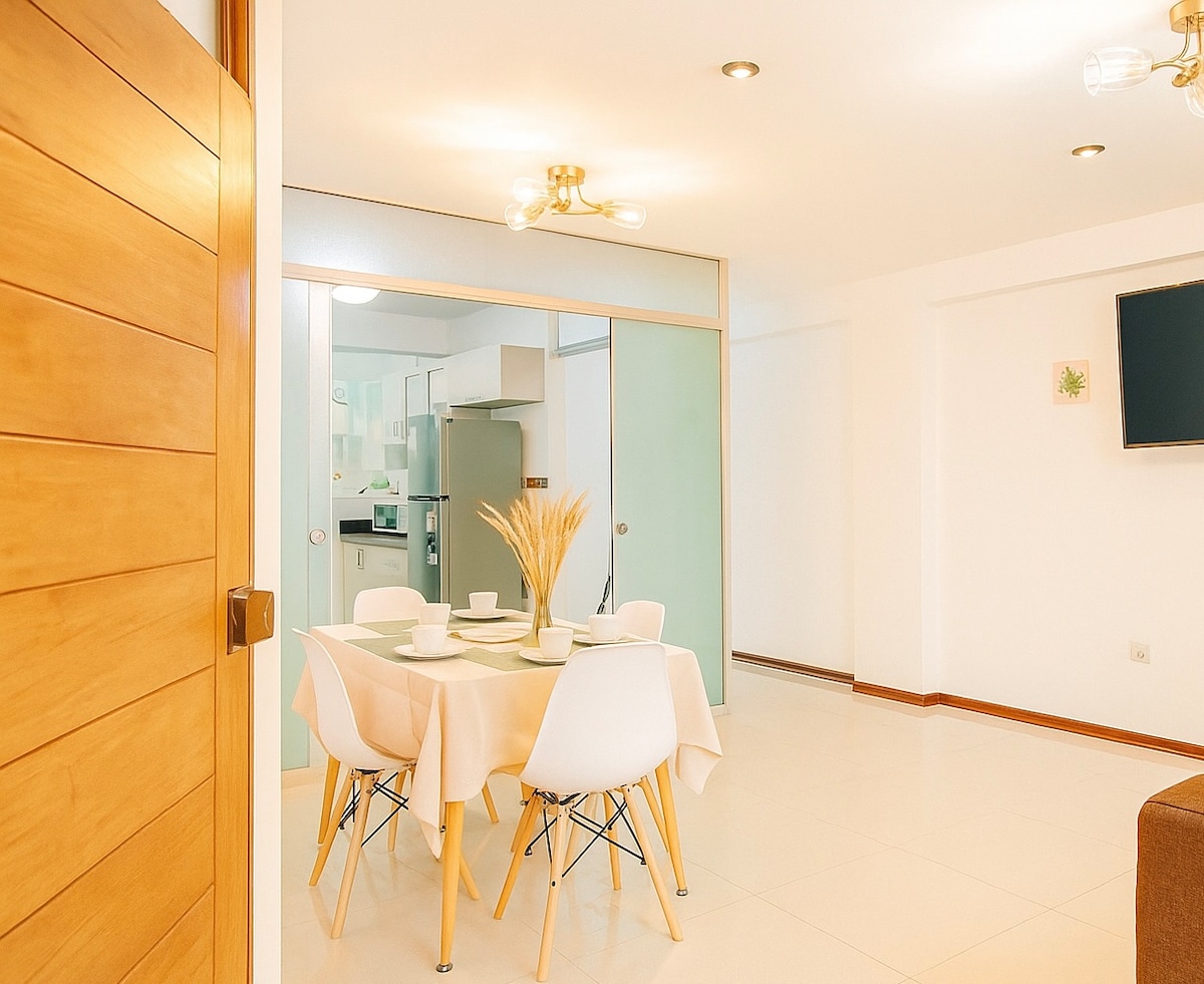 ✅ 2 habitaciones: principal con cama doble y mural artístico, secundaria con cama de 1.5 plazas y vista despejada. ✅ Sala moderna y luminosa: TV, sofá y murales que inspiran relajación. ✅ Comedor para 4 con mural floral. ✅ Cocina equipada con refrigeradora, microondas, cafetera, hervidor y utensilios. ✅ Baño estilo spa con ducha de vidrio, luz LED y detalles en madera. ✅ Ventanales amplios de luz natural. ✅ Ubicación estratégica: a minutos del centro, cerca de restaurantes, cafés y tiendas.