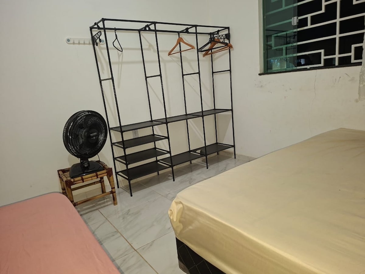 Quarto totalmente privativo com 3 camas de solteiro e 1 de casal acomodando ate 5 pessoas em um so quarto. Voce irá compartilhar banheiro, cozinha e sala de estar com hospedes do outro quarto. Você que pretende visitar Vigia, hospede-se nesse lugar super seguro, condomínio fechado no início da cidade. Casa contém Geladeira, fogão, loucas e Panelas para você fazer suas refeições basicas, sofá, tv 40'' e o imóvel ainda disponibiliza de mais 3 armadores de rede, ventiladores, mesa com 4 lugares