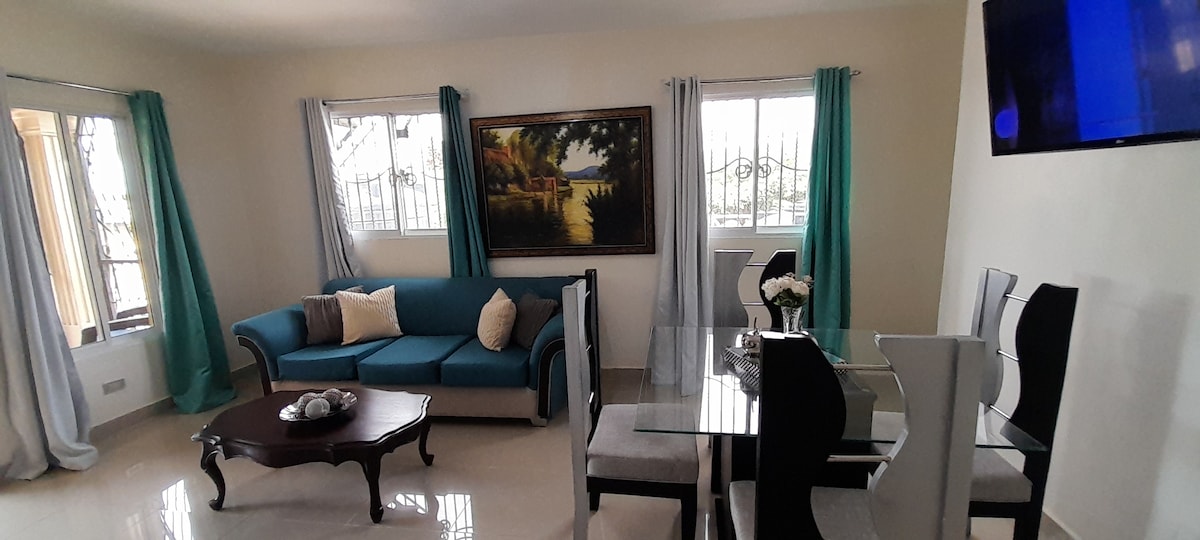 This place is in a safe new community located in the heart of Santiago De los Caballeros. This project is less than 500 meters from the Higuey Road which allows you to have access to all of Santiago and only 20 minutes from Cibao Air-Port. 15 minutes from the famous Colina Mall and only 5 minutes to beautiful Jardin Botanico and Lovera Bar. Secure two car garage. Security cameras; safe. TV in the master bedroom and LR. Washer & Dryer. Willing to provide service if you have any concerns.