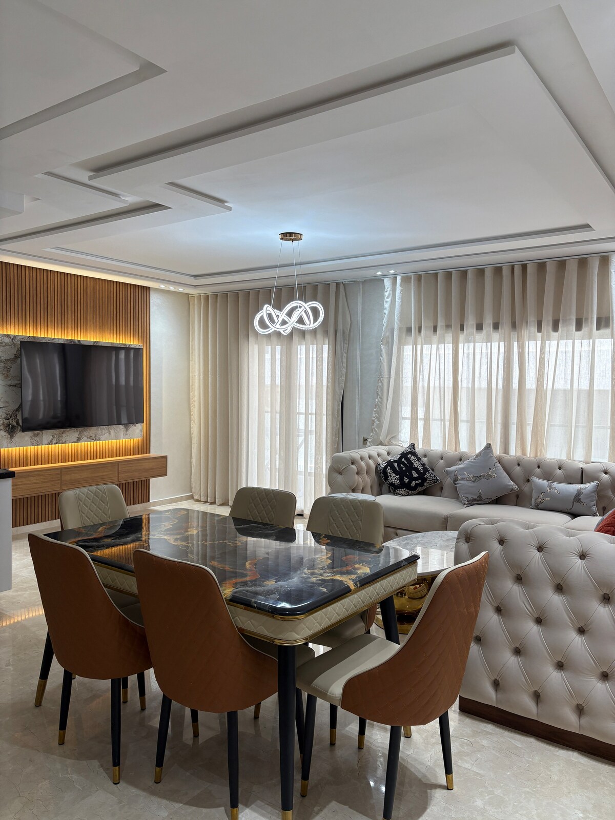 Tanca'nın prestijli Malabata semtinde, plaja, TGV tren istasyonuna ve Tanca City Mall'a sadece 2 dakika yürüme mesafesinde bulunan bu güzel modern daireye hoş geldiniz. Lüks otellere layık konfor sunan bu ferah ve aydınlık konaklama yeri aileler, evli çiftler veya iş için seyahat edenler için mükemmeldir. Konut yenidir, 7 gün 24 saat güvenlidir ve şehirdeki en iyi otellerle (Hilton, Ibis, Pestana) çevrilidir.