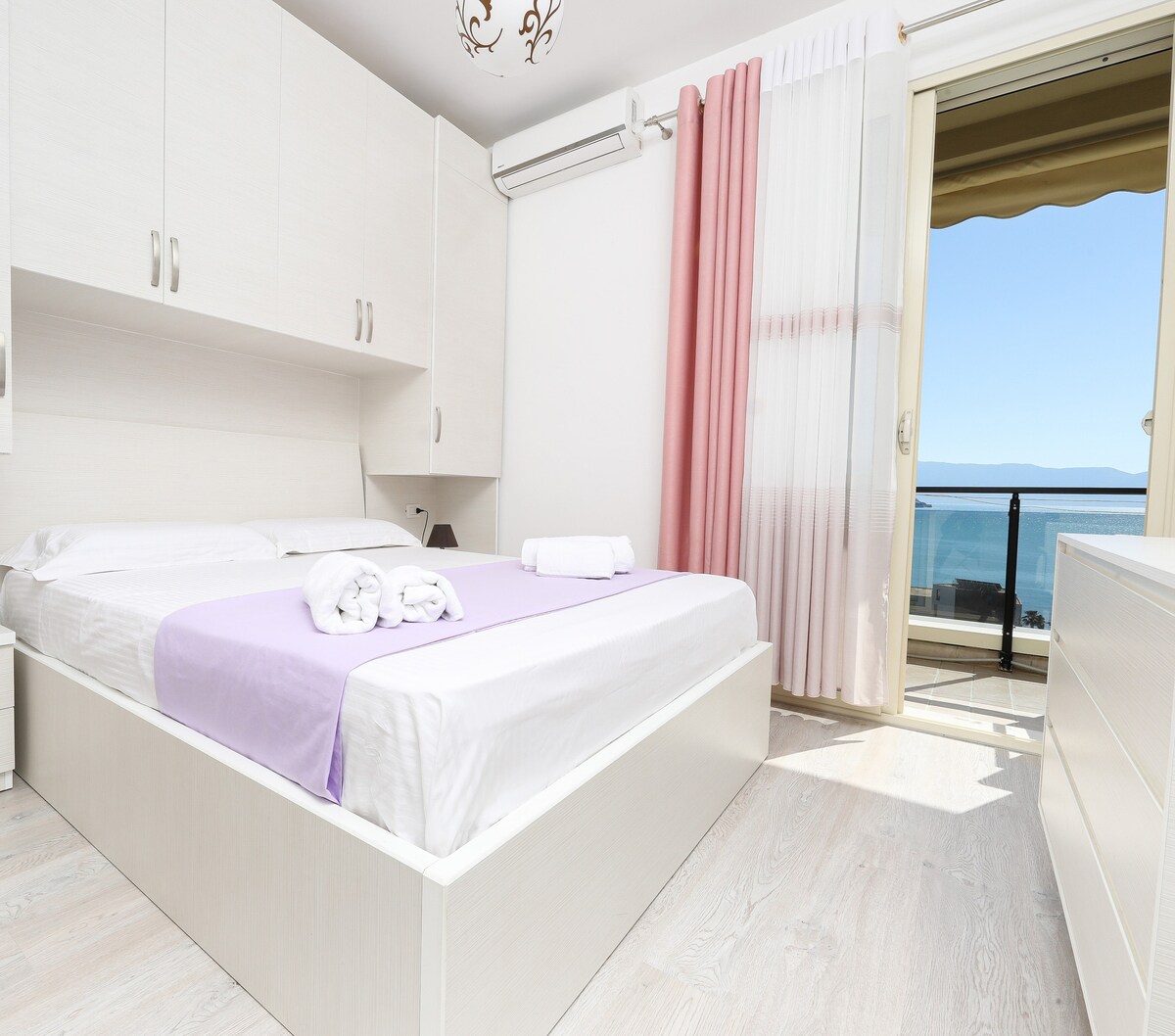 Vlora'da sahile sadece birkaç adım uzaklıkta güzel bir daire! Aileler, arkadaşlar veya dijital göçebeler için mükemmeldir. Bu aydınlık ve konforlu 2 yatak odalı, 2 banyolu dairede, büyüleyici, kesintisiz deniz manzarasına sahip özel bir balkon vardır. Tam donanımlı bir alanın, güçlü bir yönlendiriciye sahip yüksek hızlı kablosuz internet bağlantısının, yerel kafelere, restoranlara, mağazalara, tenis kortlarına erişimin veya Lungomare (kıyı şeridi) boyunca güneşli bir bisiklet sürüşünün tadını çıkarın. Dairemizden Dhërmi, Livadh vb. ünlü plajlara kısa bir kaçamak mesafesindedir.