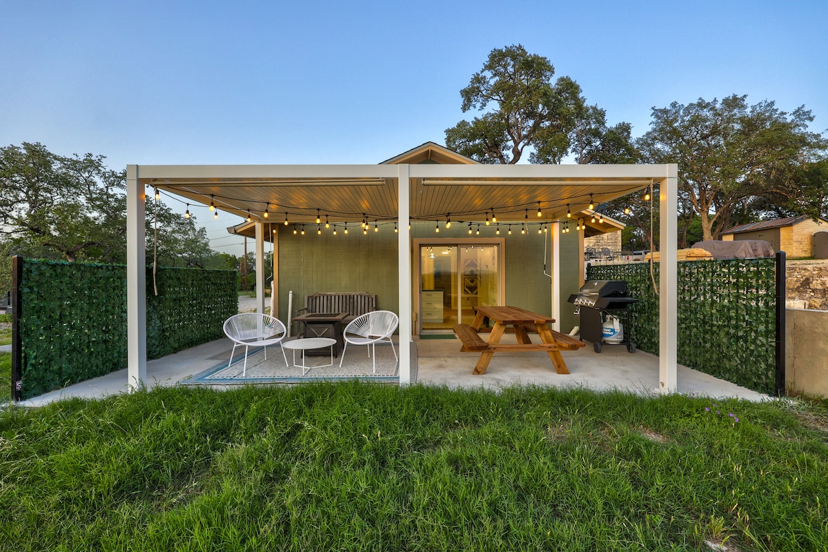 Welcome to Bee Creek Cottage — a stylish, modern escape nestled in Texas Hill Country. Perfect for couples, small groups, or bridal stays, this private oasis offers nature views, elegant interiors, and easy access to wineries & Austin. 🌊 Private deck with hot tub 🔥 Fire pit with Adirondack chairs & hill country views 🕹️ Shared Game Room 🎨 Access to on-site art gallery & walking trails 🍷 Minutes from Texas wineries, BBQ & Lake Travis