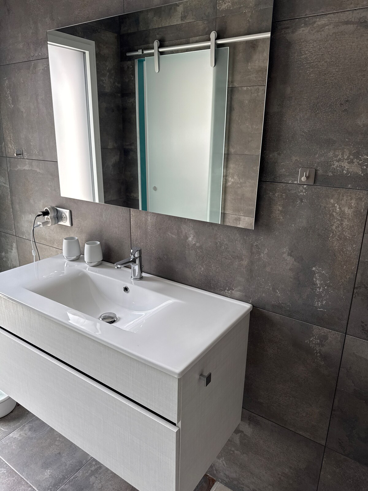 Misafirlerimizin kendilerine ait bir daireleri vardır, ancak bu daireler her zaman sadece bir gruba kiralanır. İki çift kişilik yatak ve bir tek kişilik yatak bulunmaktadır. İsteğe bağlı olarak bebek yatağı. Daire 2. katında yer alıyor, merdivenlerle erişilebilir (asansör yok), ancak çok sessiz ve Munot, Ren Nehri ve Schaffhausen'e harika bir manzarası var. Schaffhausen şehrine 10 dakikada yürüyerek ulaşılabilir. Aracınız için park yeri sağlıyoruz. Güneşin tadını keyfi için büyük çatı terası.