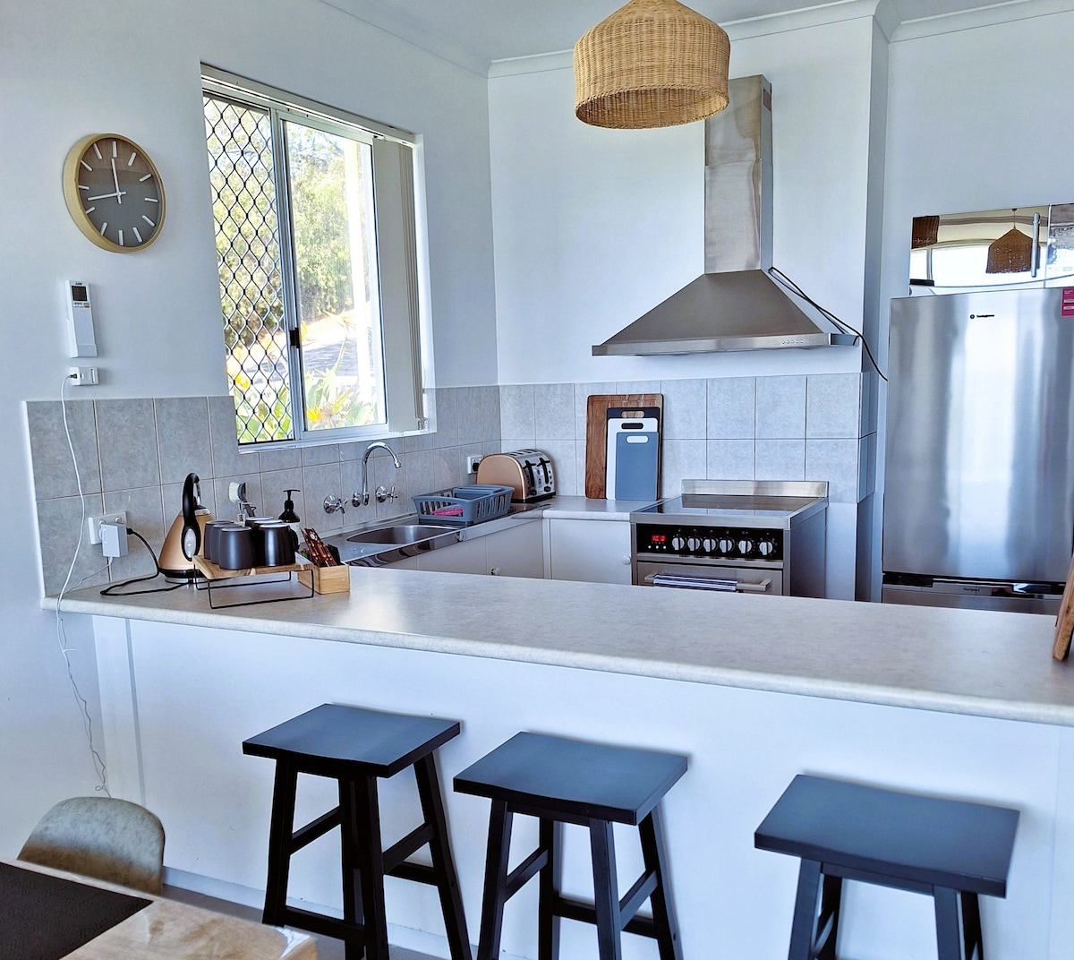 Boho tarzı Airbnb'mize hoş geldiniz. CBD ve kıyı şeridine 1 km'den biraz daha uzaktır. Tamamen çitle çevrili 0,53 hektarlık bahçemiz/avlumuz, çocukların ve evcil hayvanların çimlerde oynaması için harika bir yer. Geniş bir verandası ve barbeküsü olan bir açık yaşam alanına, ağaçların ve çardağın altında oturma düzenine de sahiptir. Kırsal bölge manzarası, Winter Hill seyir noktasına ve Happy Valley boyunca denizin bir kısmına sahiptir. Kum tahtaları ve boogie tahtaları da kullanıma açıktır