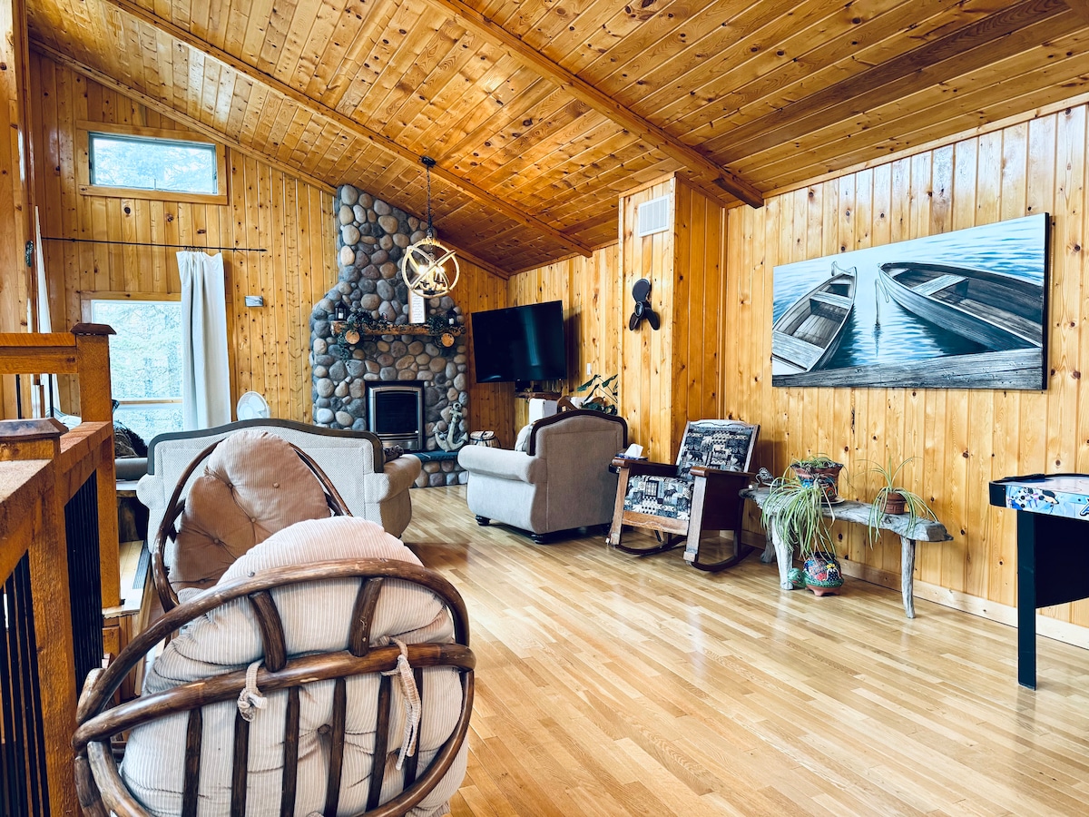 KIŞ için rezervasyon/ İLKBAHAR/YAZ/SONBAHAR 2026 Tüm ailenizi bu harika, tamamen yenilenmiş 4 mevsim göl kenarındaki kulübeye getirin. Kar motosikleti, paten (kürek çekmeniz gerekecek), kar ayakkabısı, kros kayağı, buz balıkçılığı ve kış yürüyüşünün tadını çıkarın. Yaz aylarında yüzme, plaj, kano, tembel öğleden sonraları. 5 yatak odası, 8 queen boy yatak, 2 tam banyo, çamaşır makinesi/kurutucu. Açık işlevsel mutfak/ada oturma yeri =4 . İçeride yemek masası = 10. Terasta yemek = 10+. ***UZUN HAFTA SONU REZERVASYONLARI EN AZ 3 GECEDİR***