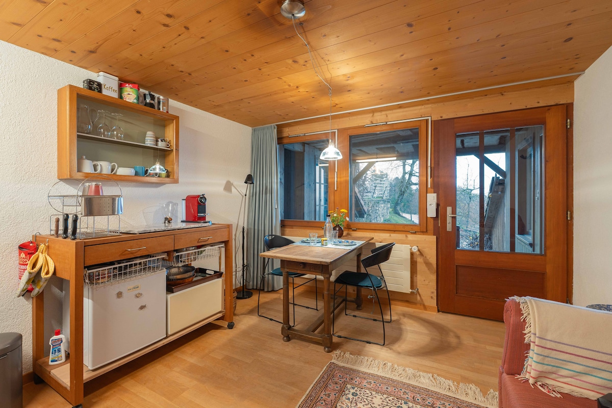 Akşam güneşin batışını ön sıradan izleyin, yıldızlara çok yakın uyuyun ve sabah kuşların cıvıltılarıyla uyanın. Hepsi ormanın kenarındaki samimi Wiesenzimmer'de mümkün. Güzel bir panoramik pencereye sahip, özenle yenilenmiş karavanımız, Stockhorn sıradağları ve Aare vadisinin manzarasına sahip, ormanın hemen kenarındaki meyve bahçemizde duruyor. Şehrin koşuşturmacasından uzakta, ruhunuza bir mola vermek için mükemmel bir yer.