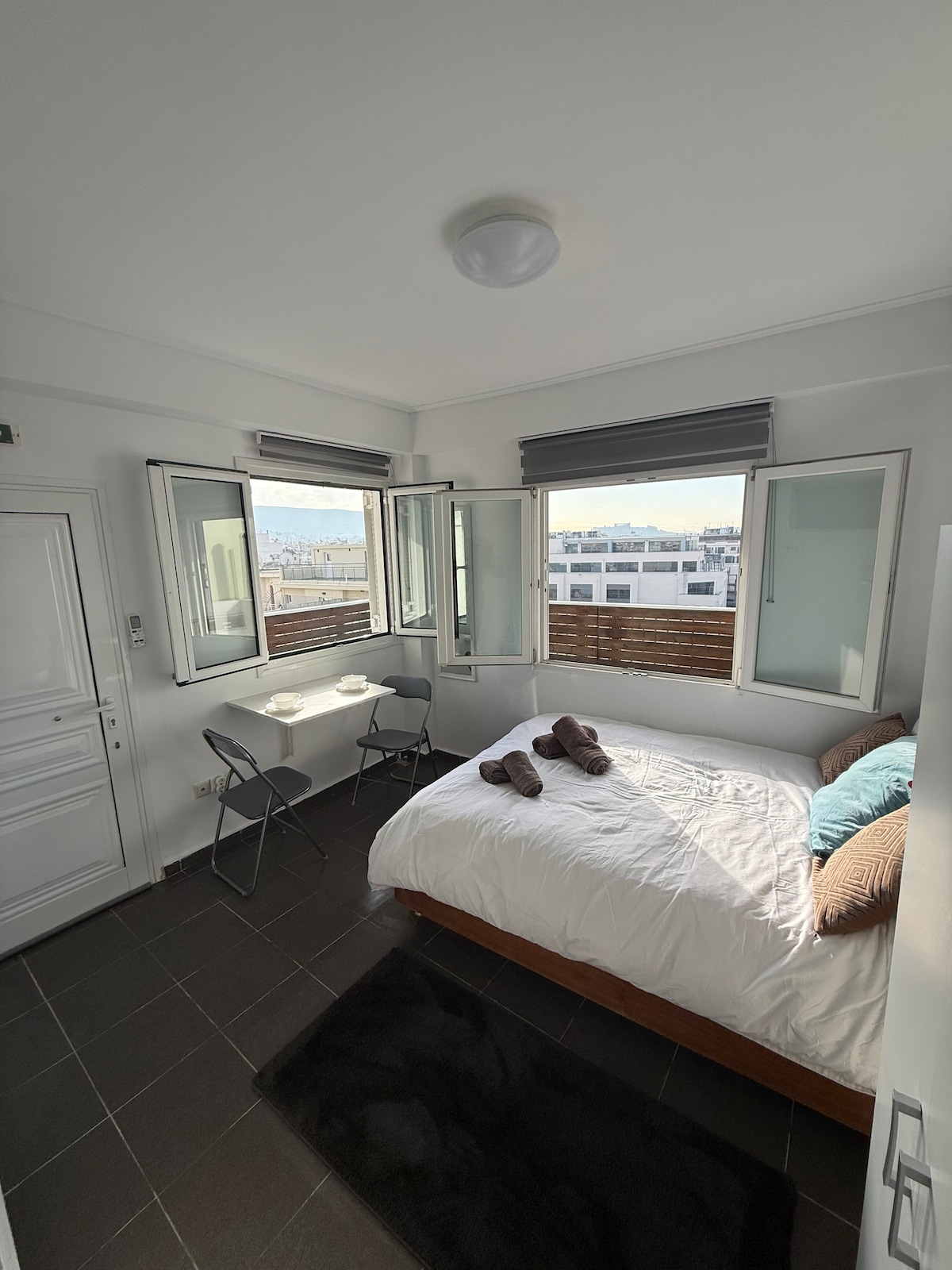 Newly renovated! Unique Acropolis, Parthenon & Lycavettus view from the comfort of your Roof House with a private balcony. For 2 guests HEIGHT-(bathroom&kitchenette)-1.78cm. Free VDSL WIFI (70-100 mbps) Double bed-mattress-Jysk GoldF30 Smart 32"TV+Netflix+Disney Kitchenette & bathroom. AC & standing fan. Free washing machine(detergent not provided). Smart phone needed-self check in/out. Passport pic/EU ID needed within 48 hours of booking or some hours if last minute. Smoking outside only