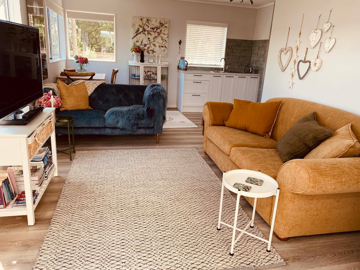 Maksimum 3 misafir (rahatlıkla 2) Bebekler/çocuklar için uygun değil. Whakatane'ye açılan kapıda konumlandırılmış, tüm olanaklara kolayca erişilebilir. Bağımsız 1 x Queen yatak odası, 1 x Queen yatak odası (daha küçük) banyo, oturma odası, küçük mutfak, spa havuzu ve ateş çukuru olan dış alan. Sokak dışında bolca park yeri. Özel giriş: Ana giriş 2 adım. Ranchslider girişi 1 adım. Yerel mağazalara kısa yürüyüş mesafesinde. Kasaba 20 dakika yürüme mesafesinde. Temizlik kuralları/talepleri olmadan 10 $ tutarında minimum temizlik ücreti